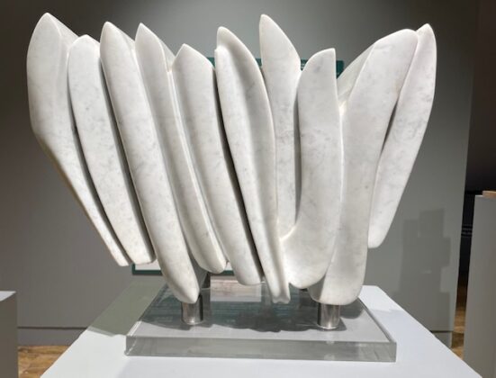 Con esta vocación de buscar formas nuevas surgen obras como ‘Bandera de niebla’, ejecutada en alabastro de Zaragoza, que constituye una pantalla plegada de color blanco inmaculado; ‘Bosque fósil’, en mármol blanco Macael, donde los pliegues de la pantalla se transforman en relieves de líneas verticales; y siguiendo con formas de pantalla, en ‘Acoplándose’, la estructura crea una sucesión de pantallas que se amoldan y se contraen en cortes verticales.