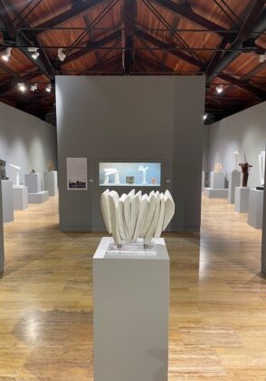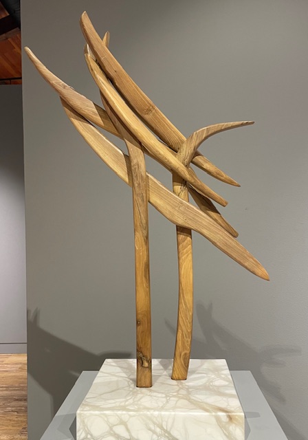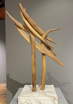 Las esculturas de madera –‘Instantes’, ‘Fugacidad’ y ‘Trampas de aire’–, combinan la verticalidad con la horizontalidad de piezas de pequeño tamaño cruzadas como ramalazos o estelas que se incrustan entre hieráticos pilares. Son obras livianas, como el propio material con el que han sido creadas, con muchos huecos intermedios que dejan abiertos los espacios y con estructuras entrelazadas que terminan en incisivos puntales.