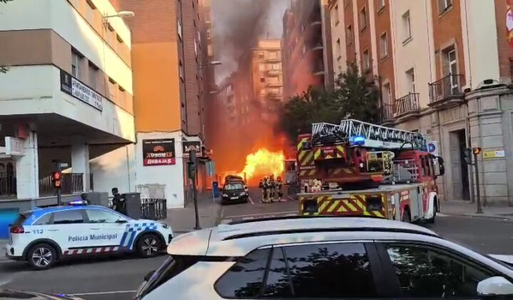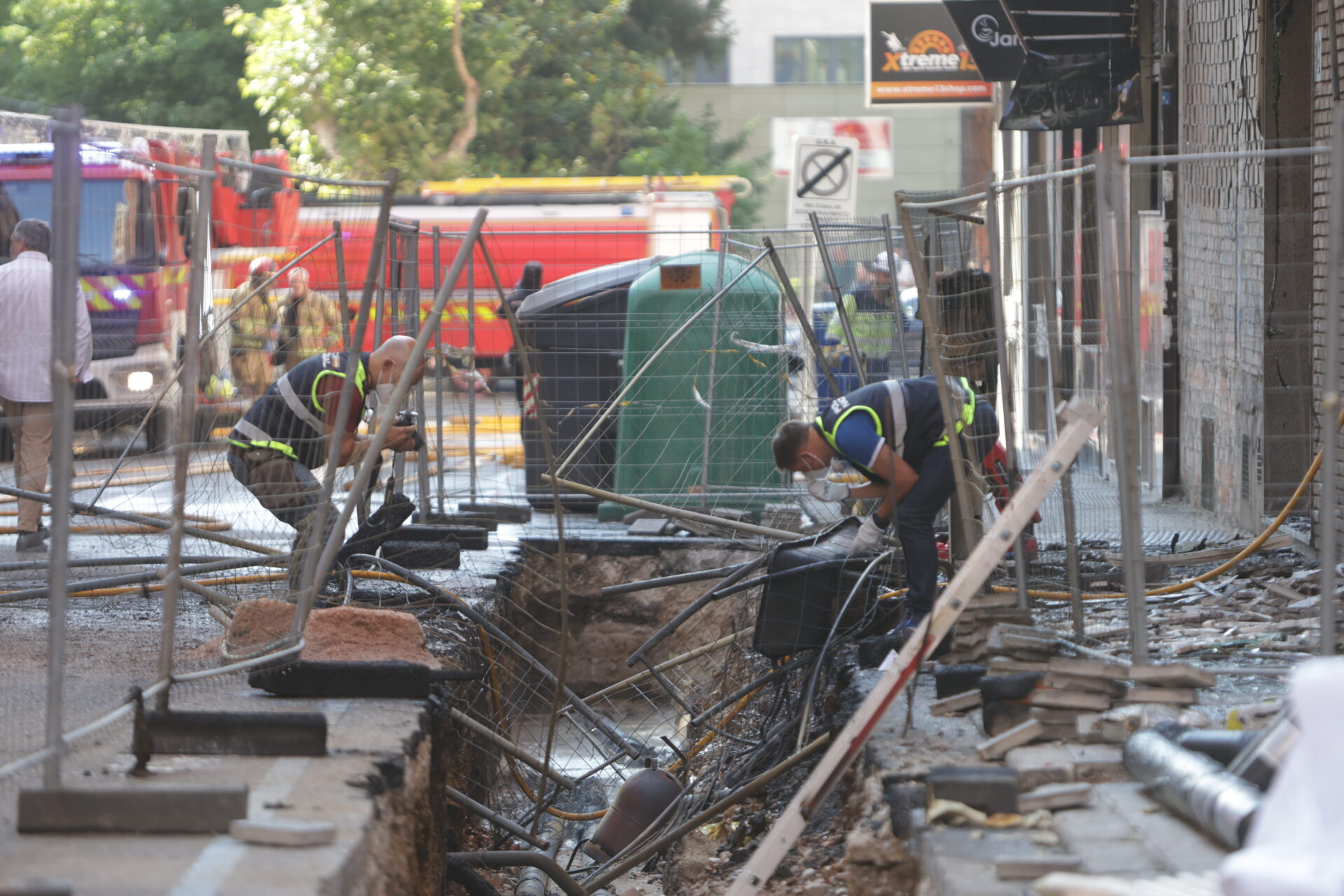 El suceso, presuntamente causado por un accidente en las obras de instalación de la red de calor que afectaron al suministro subterráneo de gas, generó una fuerte explosión que alarmó a vecinos y transeúntes, seguido de un fuego con llamaradas de más de seis metros de altura que afectó a los edificios colindantes y a un camión de reparto de bebidas estacionado en la acera de enfrente.