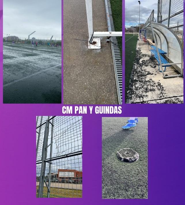 En su comunicado señalan casos como el de Pan y Guindas, donde “desde hace más de dos años, los equipos de fútbol 11 —formados por niños y niñas a partir de 12 años— que se ven obligados a entrenar en este campo municipal, una instalación que presenta un estado deplorable y peligroso para la práctica deportiva. El césped se encuentra en condiciones lamentables, con zonas secas, irregulares y resbaladizas. Además, trozos de los ladrillos que delimitan el campo están caídos desde hace años, el recinto está rodeado de malas hierbas con pinchos, y el acceso desde los vestuarios al campo está lleno de piedras grandes”. Además, señalan que “Pan y Guindas es la única instalación deportiva municipal sin celador, lo que obliga a los propios entrenadores y responsables del club a abrir y cerrar las puertas cada día, asumiendo tareas que no les corresponden”.