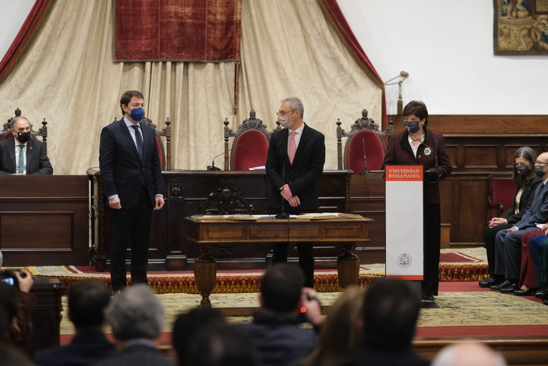El acto institucional de toma de posesión ha contado con la presencia del presidente de la Junta de Castilla y León, Alfonso Fernández Mañueco, quien le ha felicitado por la reelección nada más acercarse al Edificio Histórico del Estudio salmantino, junto al presidente de las Cortes de Castilla y León, Luis Fuentes, el presidente del Consejo Social de la USAL, Ignacio Sánchez Galán, y otras autoridades políticas, sociales, militares y eclesiásticas.