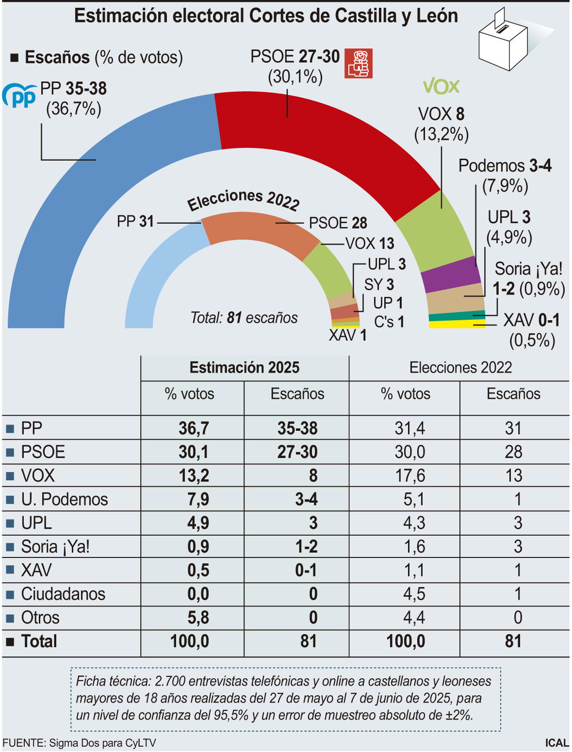 Así lo refleja una encuesta de Sigma Dos para Castilla y León Televisión (CyLTV), con un total de 2.700 entrevistas telefónicas y online realizadas entre el 27 de mayo y el 7 de junio, con un nivel de confianza del 95,5 por ciento y un error de muestreo del +-2. Además, refleja un hemiciclo con hasta cuatro partidos más pues Podemos obtendría entre tres y cinco procuradores; UPL, otros tres; Soria YA uno o dos y Por Ávila mantendría el parlamentario o podría desaparecer del Parlamento autonómico.