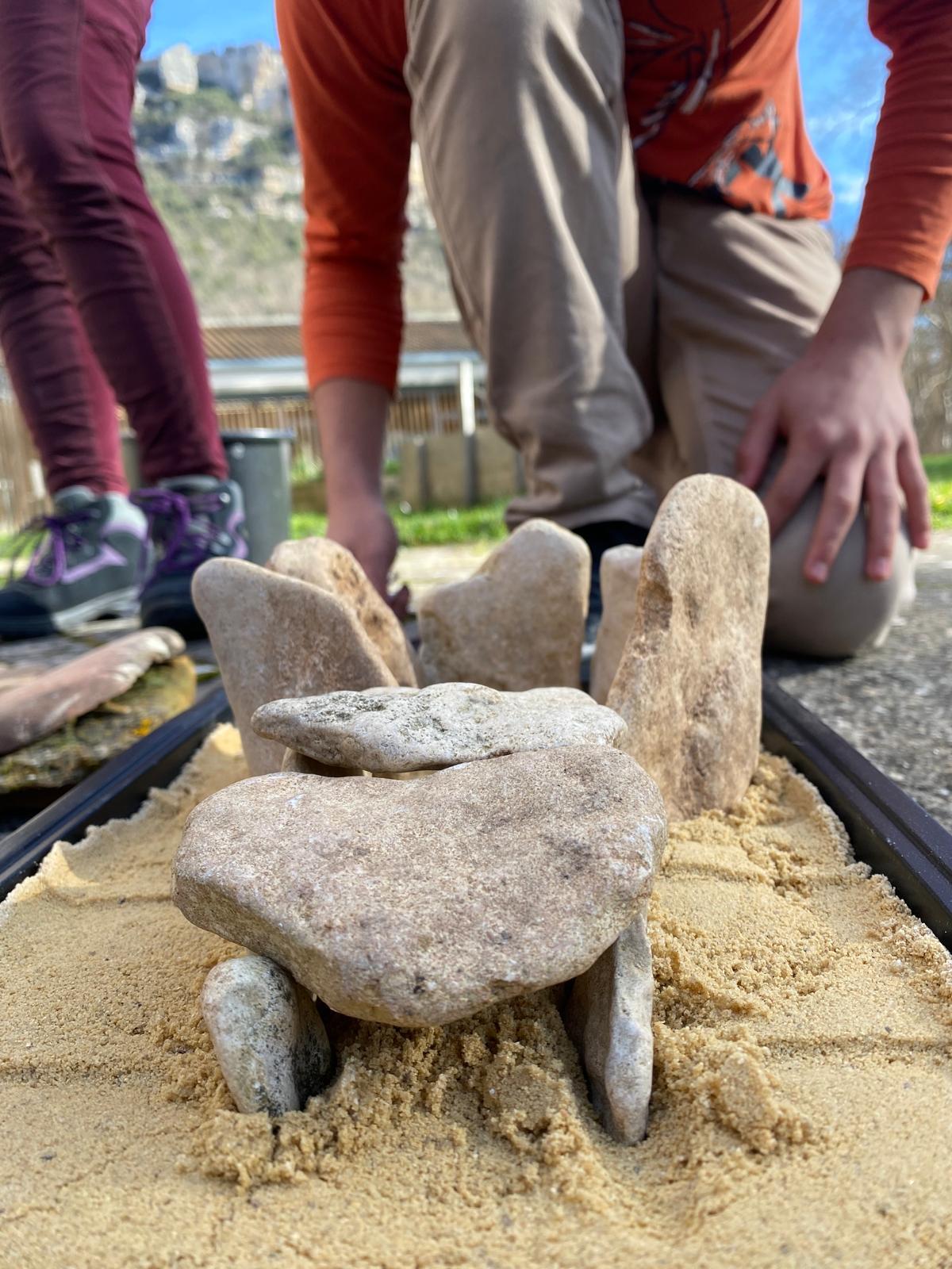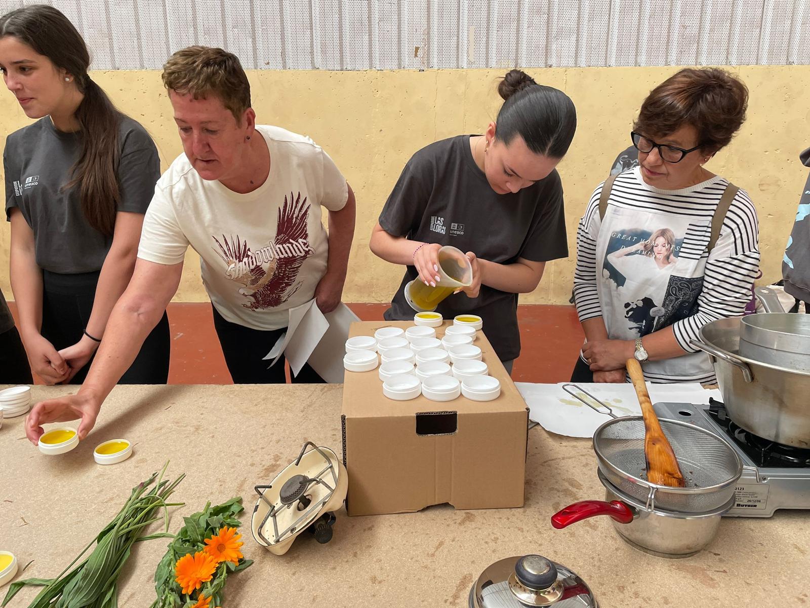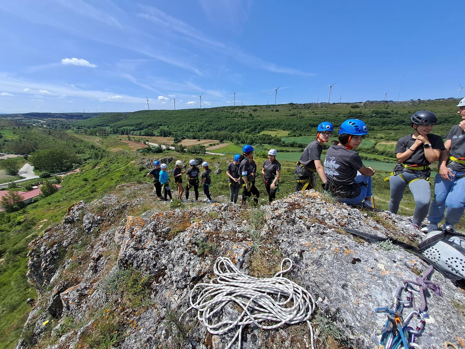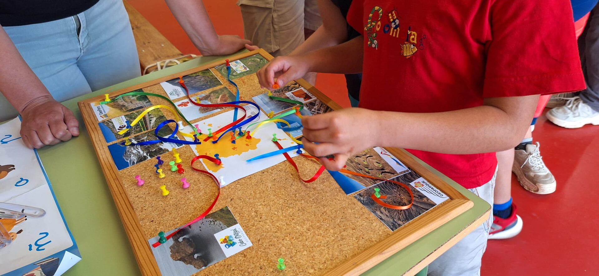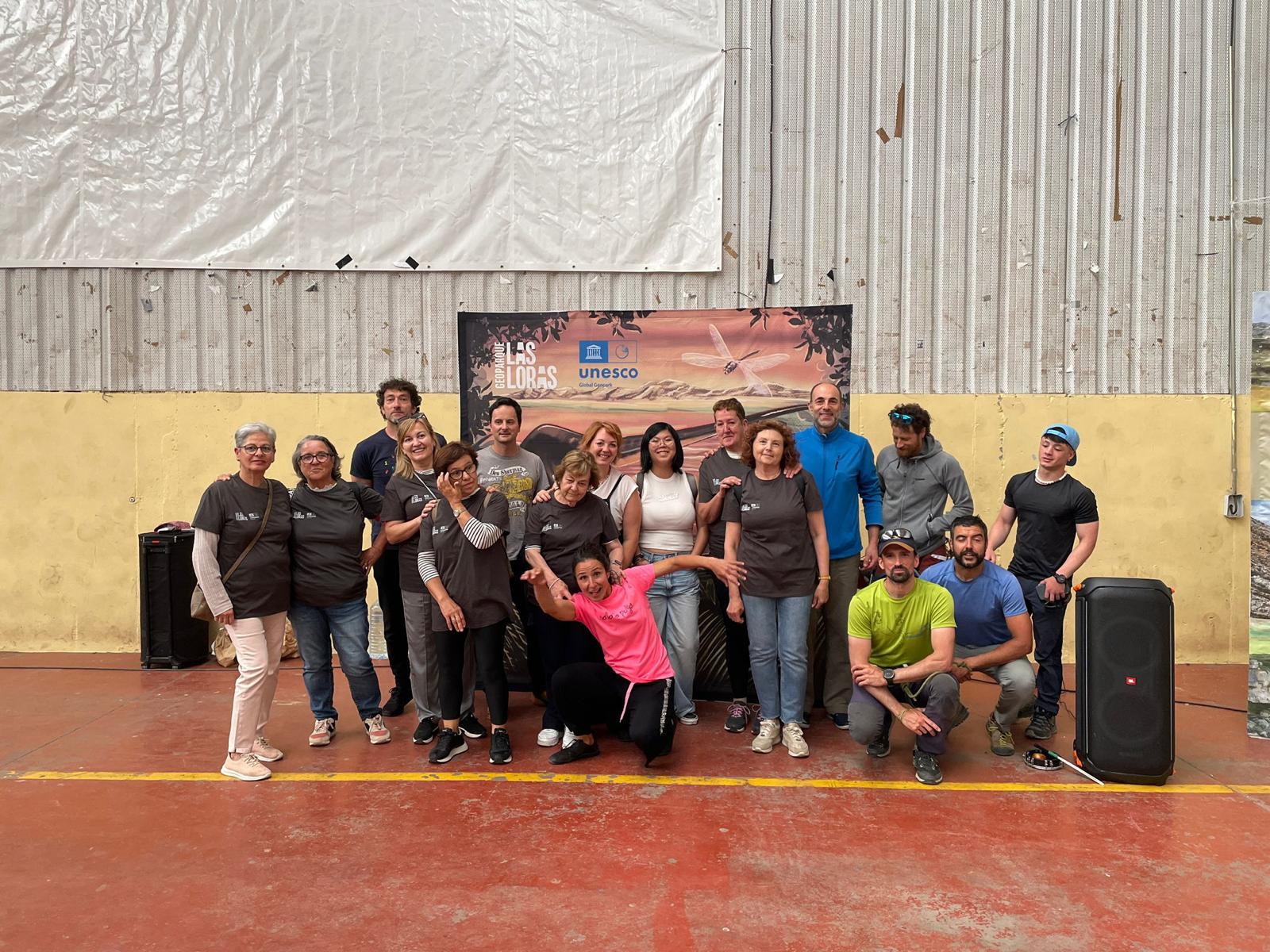Durante la mañana, el alumnado presentó los trabajos realizados en clase, cada uno vinculado a una temática relacionada con el patrimonio natural y cultural del Geoparque y adaptado a un formato específico. La jornada continuó con actividades de rappel, orientación, juegos de equilibrio y malabares y una animada coreografía de jotas modernas. También hubo talleres de elaboración de cremas naturales con plantas de la zona, decoración de geocakes, arte y ciencia con pigmentos naturales y cianotipia. Y, para remate, durante el encuentro se ofreció a cada participante almuerzo, comida y merienda, todo preparado con productos ecológicos y de proximidad.