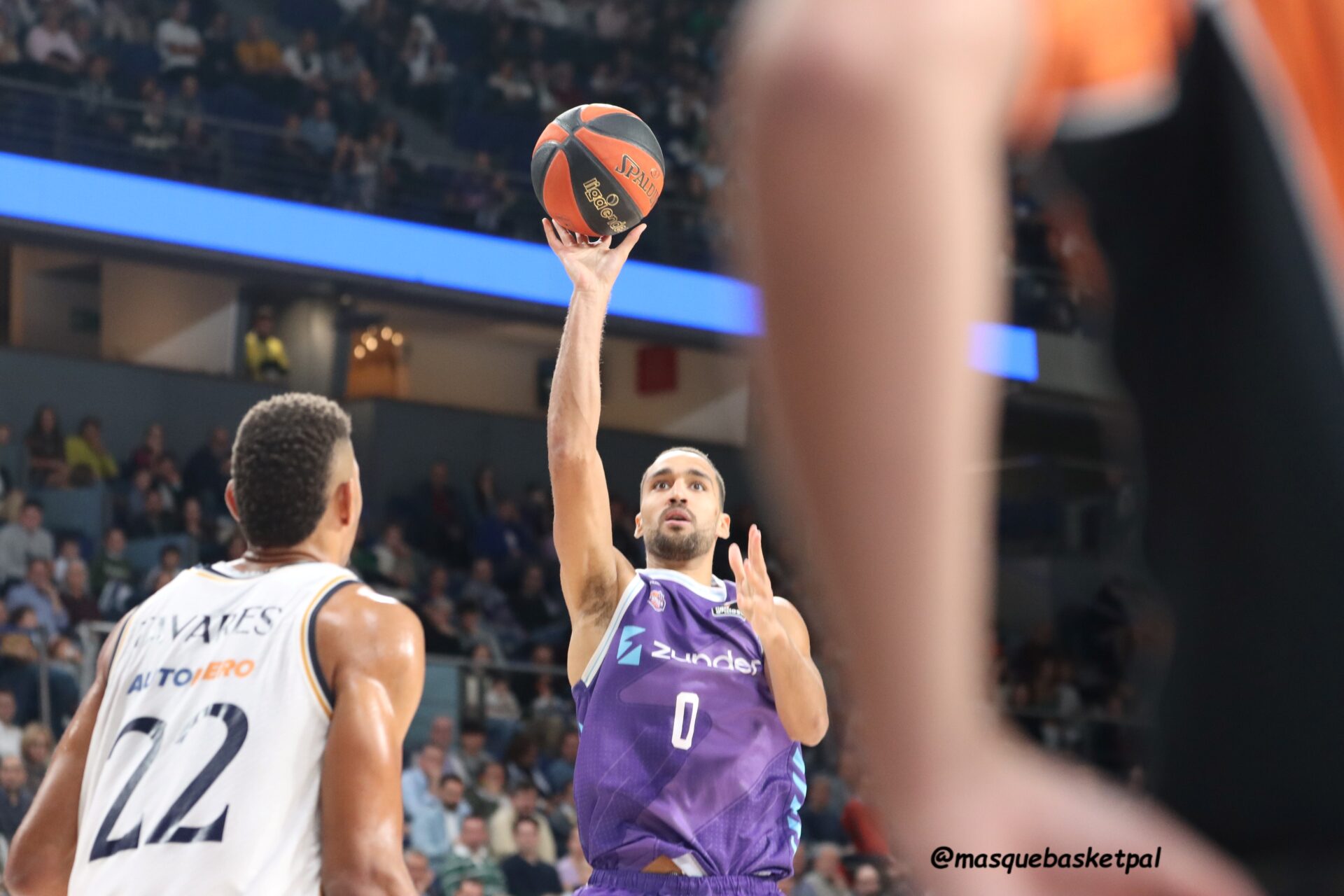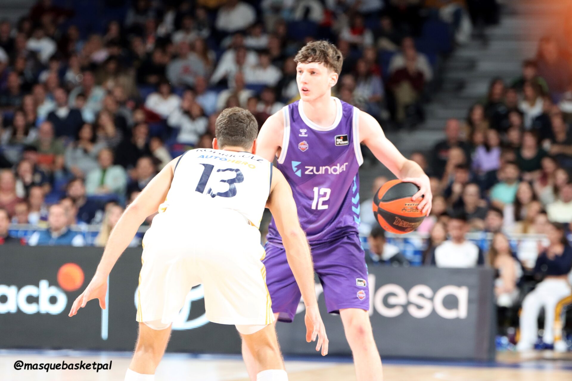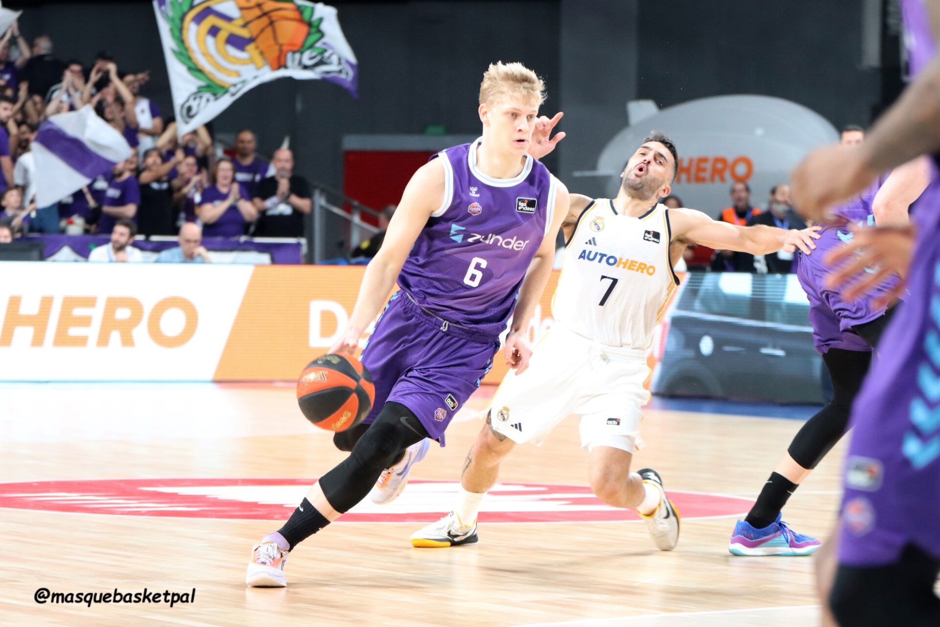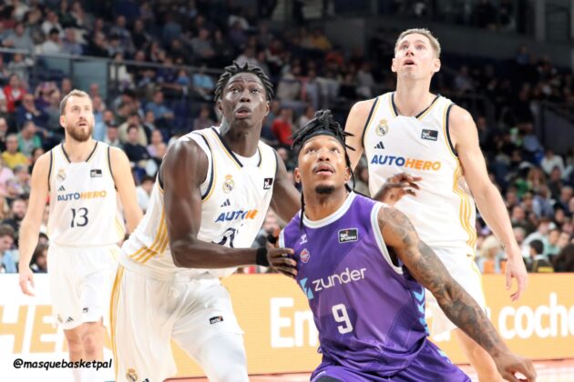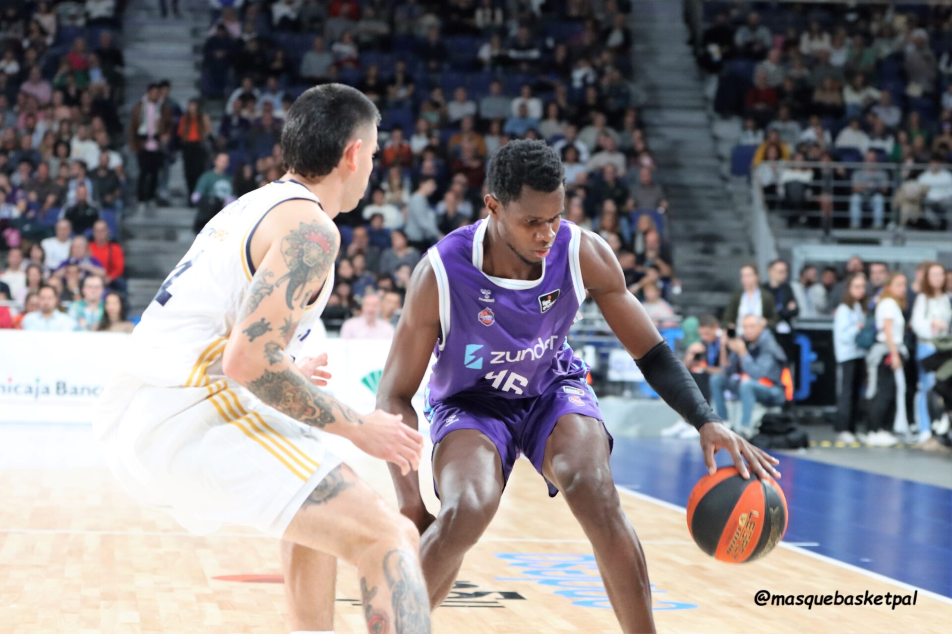 Segundo cuarto siguió la misma tónica. Sin acierto en los pases interiores de los morados que solo encestaban tirando de individualidades. Con una defensa sobrepasada por los locales, solo enmendados por Ousmane, que sacó varios robos a los atacantes merengues.