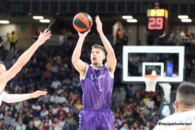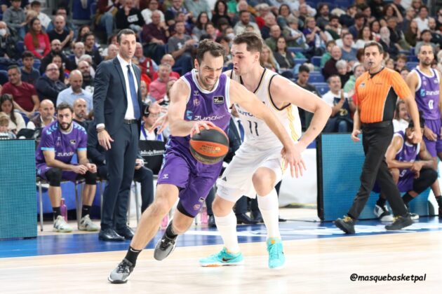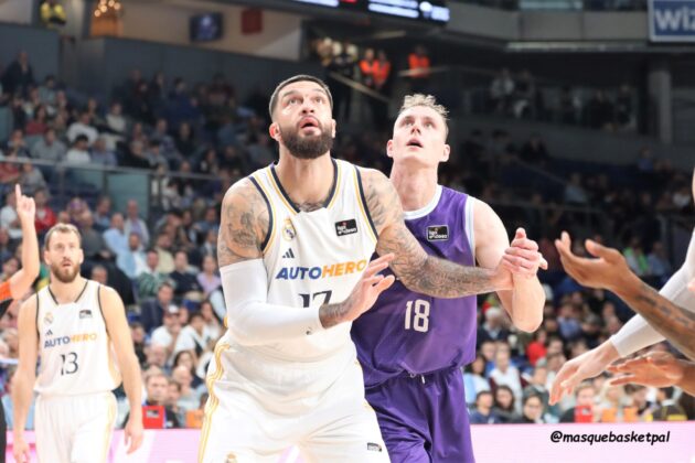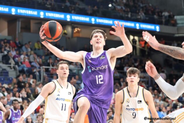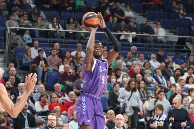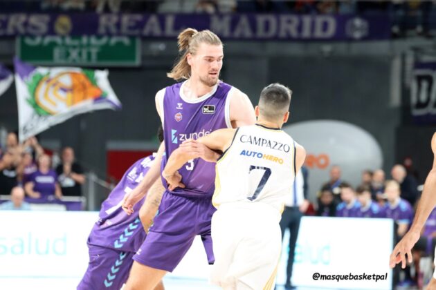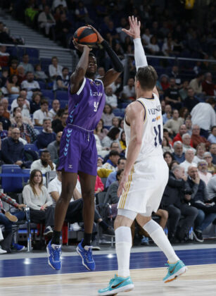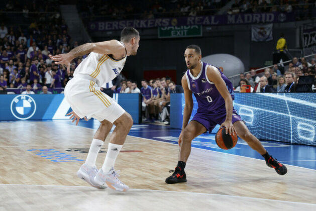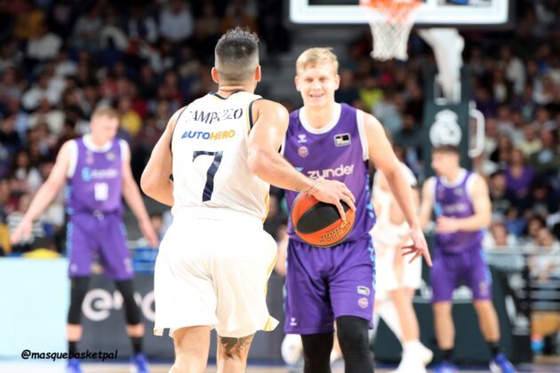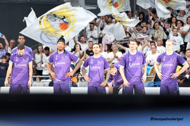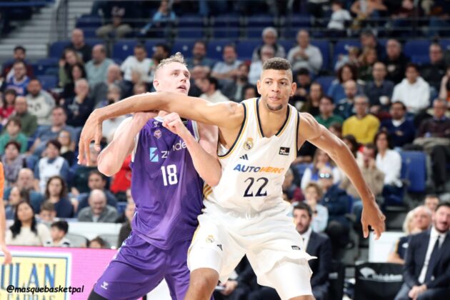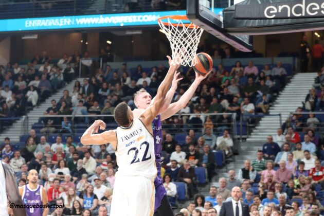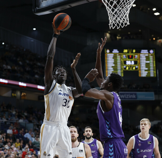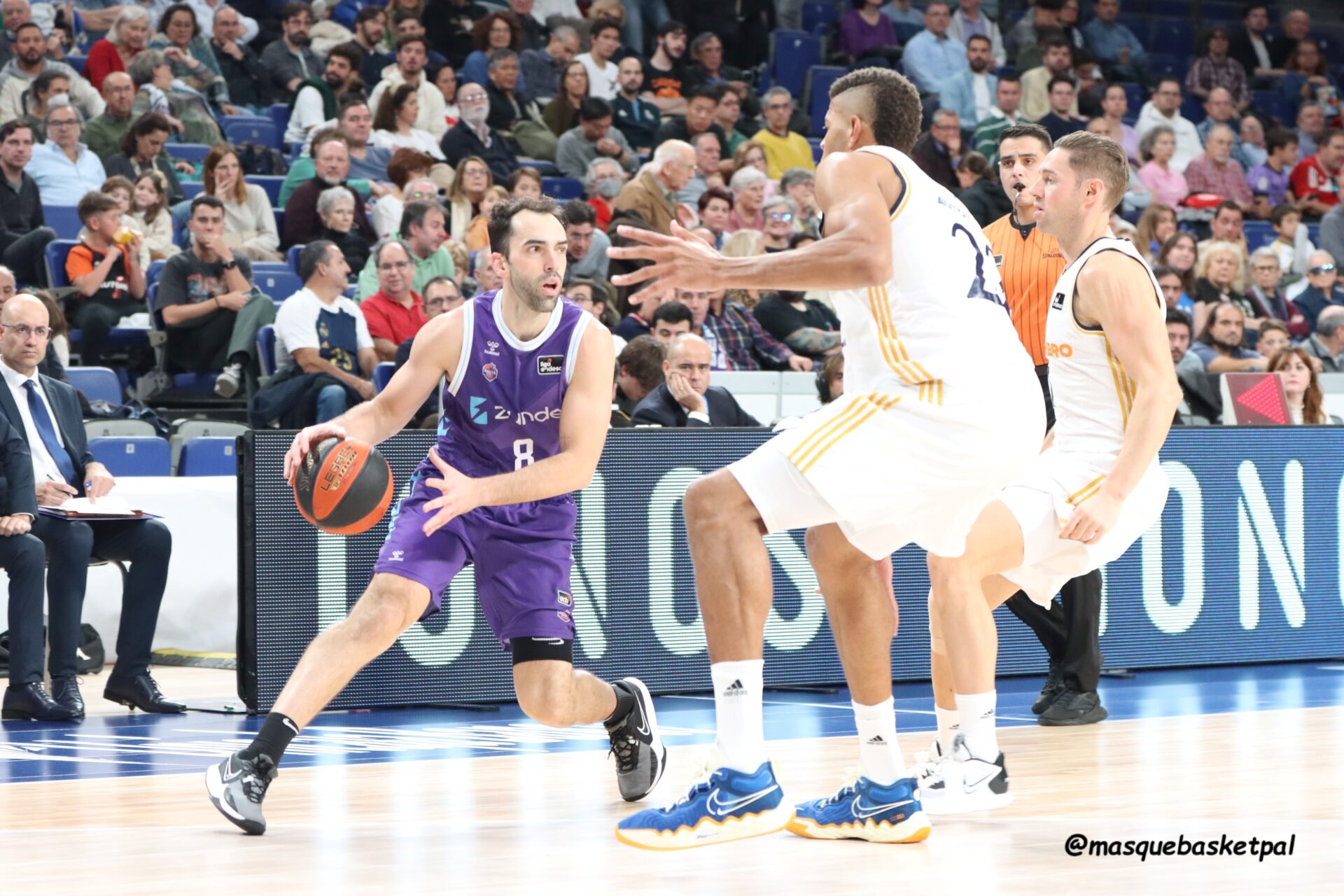 Segundo cuarto siguió la misma tónica. Sin acierto en los pases interiores de los morados que solo encestaban tirando de individualidades. Con una defensa sobrepasada por los locales, solo enmendados por Ousmane, que sacó varios robos a los atacantes merengues.