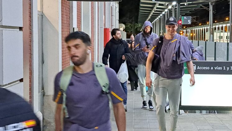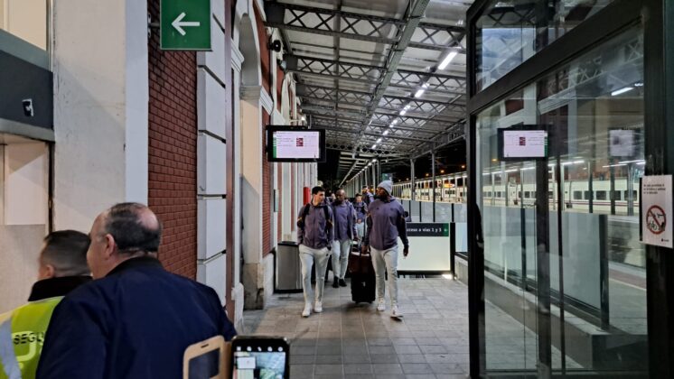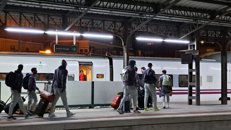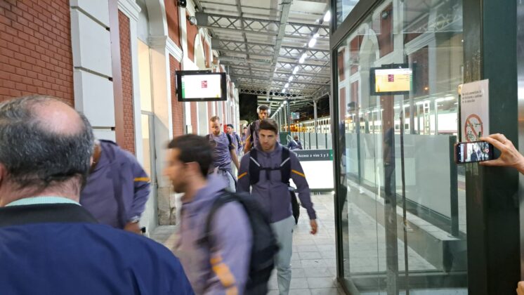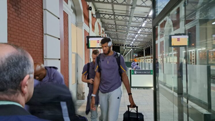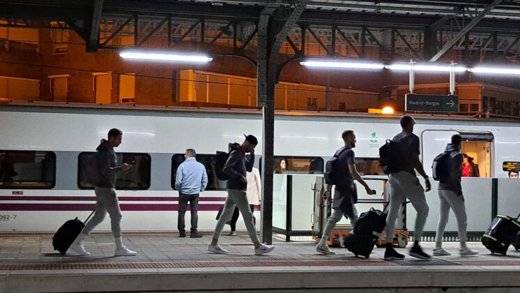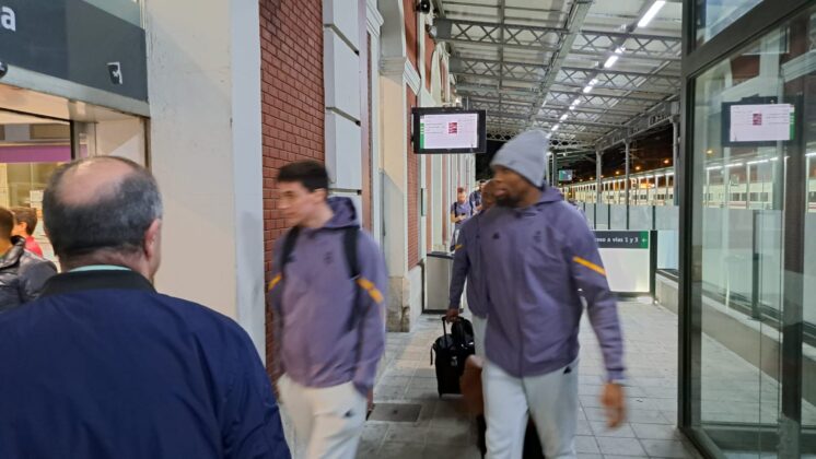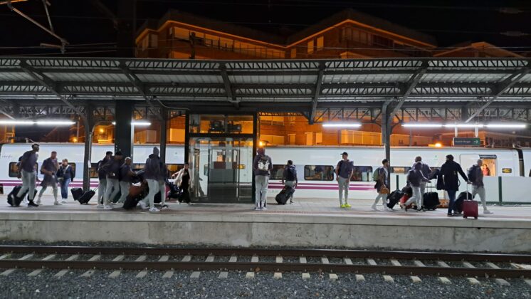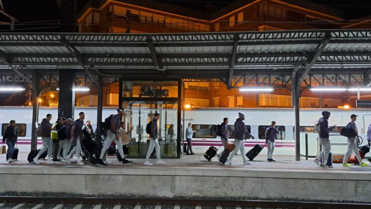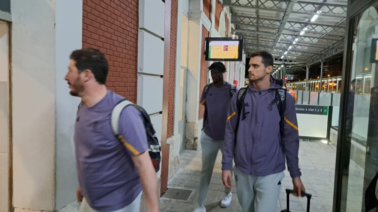 Había pocas opciones para recorrer el trayecto de Palencia desde Madrid. Finalmente, la expedición del Real Madrid de baloncesto ha escogido el tren como medio de transporte para llegar a la capital palentina, en concreto, en el Alvia que salía desde Chamartín a las 19:08 y que ha llegado, puntual, a las 20:37 a Palencia.