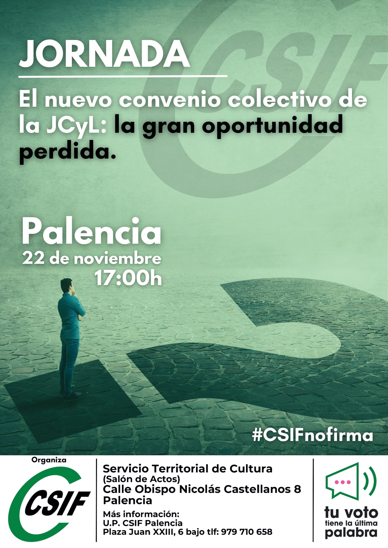 El sindicato CSIF organiza mañana miércoles, 22 de noviembre, una jornada informativa con el Nuevo Convenio Colectivo para el personal laboral de la Junta de Castilla y León. Asistirán las personas que negociaron este convenio por parte de CSIF, y que presentarán los aspectos que difieren del anterior.