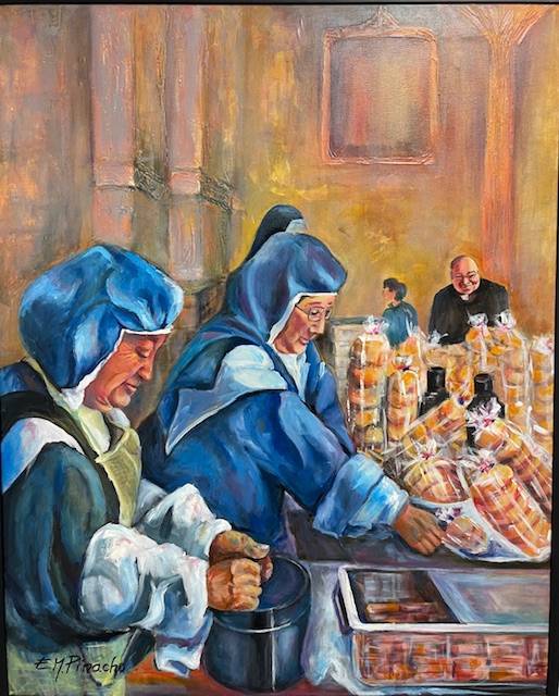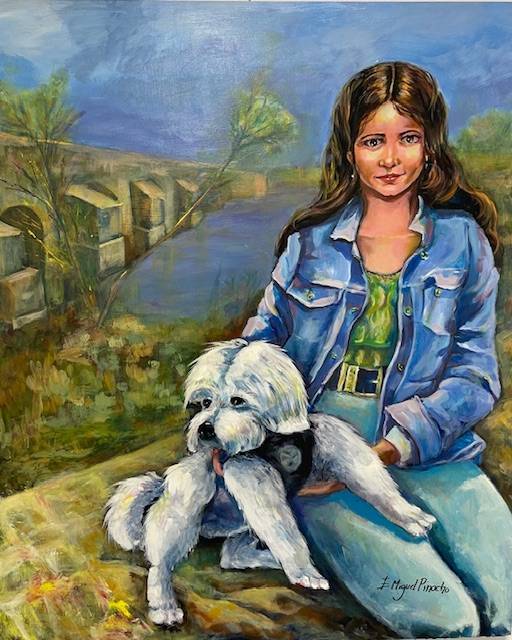 La figuración humana está presente en dos obras. Una de ellas es una simpática escena de un grupo de religiosas sirviendo sus típicas pastas, un homenaje sin duda a las religiosas clarisas de convento de la Consolación de Calabazanos, en Villamuriel. La segunda pieza es el retrato de una adolescente junto a su perro, una potente imagen de ambas figuras que contrasta con el perfil bajo del puente que aparece a la izquierda del cuadro. El rostro de la joven mantiene una mirada directa a espectador mientras que el del animal aparece distraído –tampoco hay cartela en este cuadro que informe de su título–.