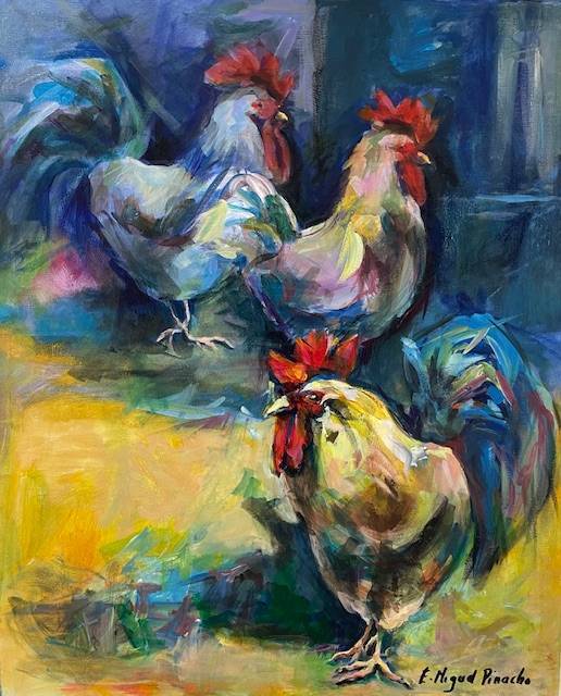 Temáticamente, abordan motivos ya conocidos en anteriores exposiciones de Miguel Pinacho, como los paisajes, las flores, gallinas, marinas, el Canal de Castilla y retratos. Temas de su entorno vital que ella plasma con un lenguaje plástico entre las técnicas impresionista por la pincelada y expresionista por el color y la figuración realista.