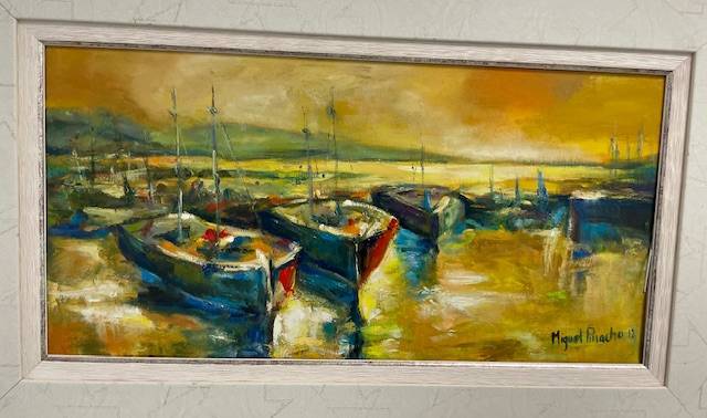 El uso de una paleta cromática amplia y a su vez con matices en los tratamientos constituye una de las fortalezas de esta pintora. Elena Miguel aborda el color con absoluta libertad, que en ocasiones motiva que se replantee la escena, como en las barcas, donde el azul del mar y del cielo ha sido sustituido por una gama de ocres que contrasta con la potencia de las barcas.