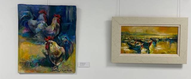 La exposición se cierra con un cuadro titulado ‘Desastre en la dana’, que constituye un homenaje personal de la pintora a las víctimas del trágico temporal sufrido el año pasado en Valencia, una obra cargada de simbolismo donde grandes gotas de agua conviven con elementos florales, es decir, la muerte y destrucción que trajo el agua frente la vida que nace de la flor.