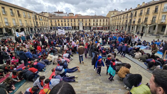 Alumnos, docentes y familias de Escuelas Católicas Palencia, unos 500 participantes, se reunieron ayer en la Plaza Mayor para visibilizar su modelo educativo y los valores que comparten