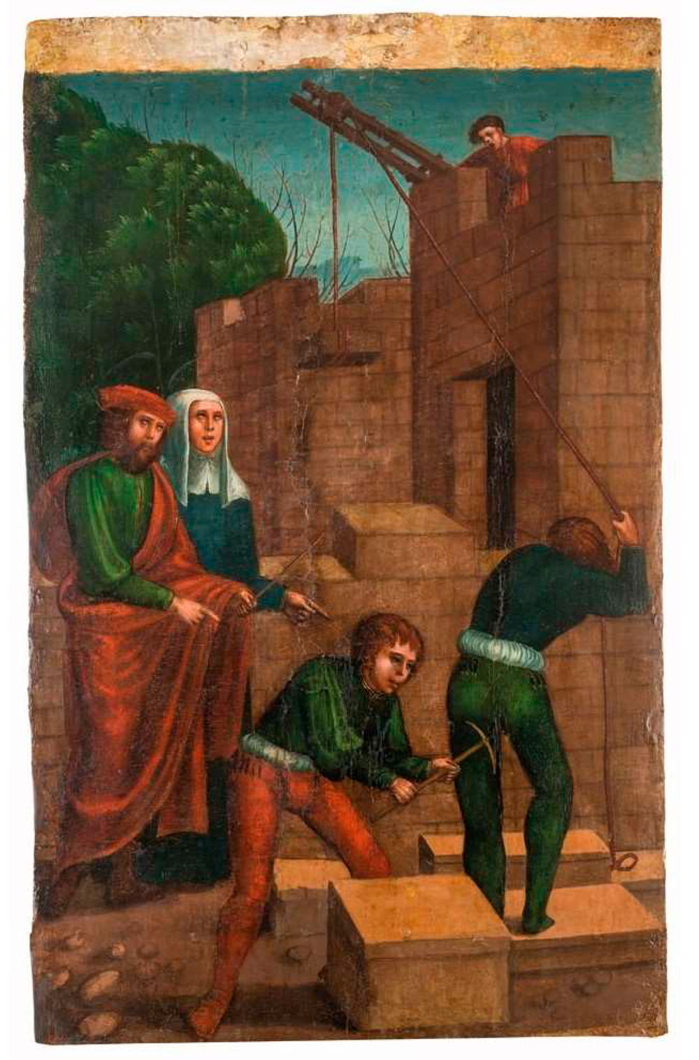 11San Julián y Santa Basilisa construyendo un hospital para peregrinos: Anónimo. Óleo sobre tabla. H. 1530. Iglesia parroquial de San Julián, de Arroyo.