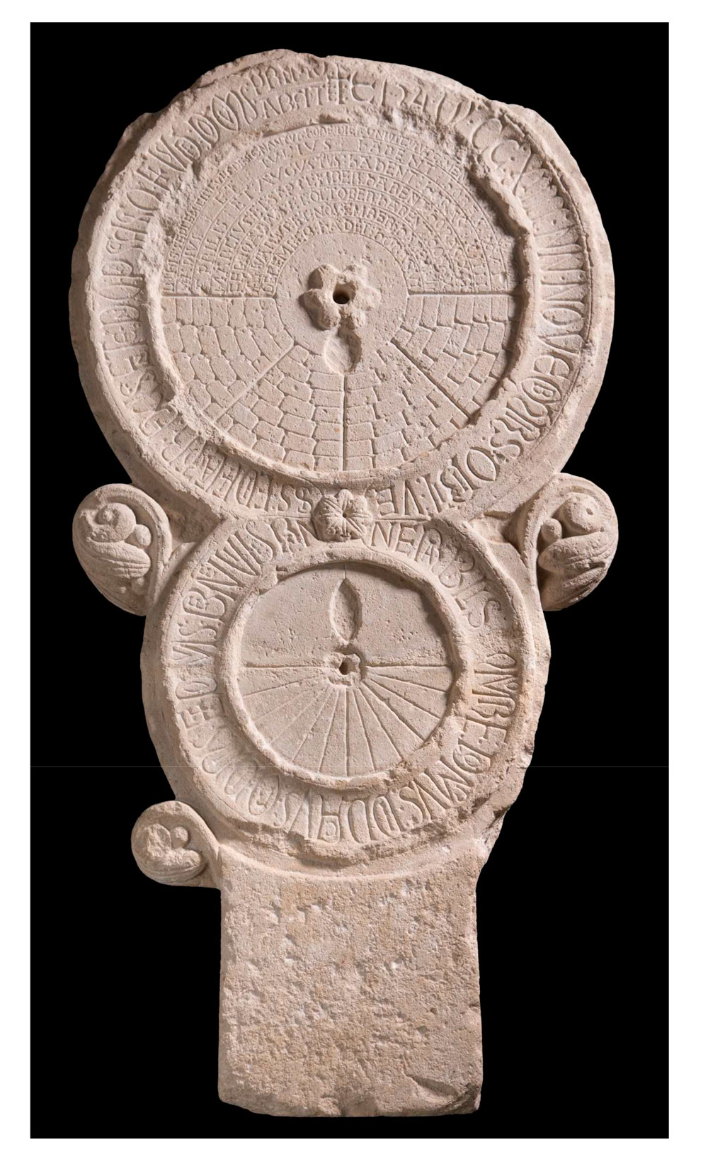 12Lápida fundacional del Monasterio de Santa María de Benevívere, reloj y calendario litúrgico: Anónimo. 1176. Piedra caliza. Museo Diocesano de Palencia.