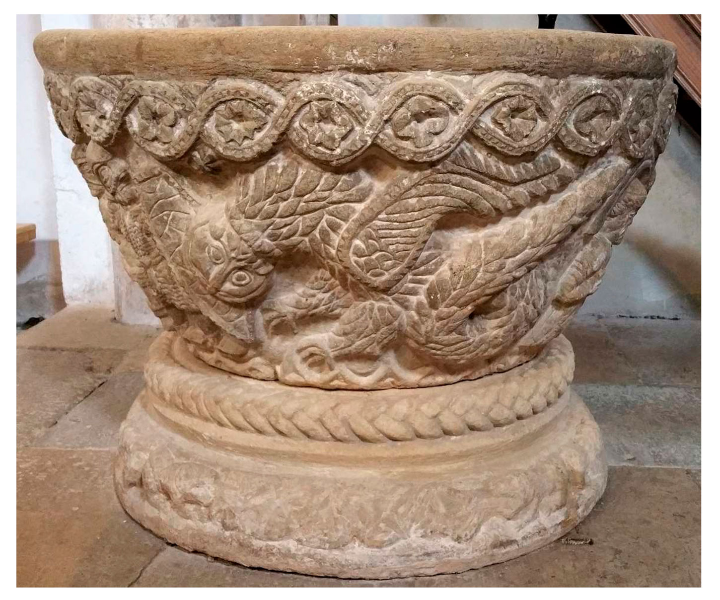 16Pila bautismal: Taller local anónimo. Finales siglo XII-principios XIII. Iglesia parroquial de Santa Ana, Cantoral de la Peña.