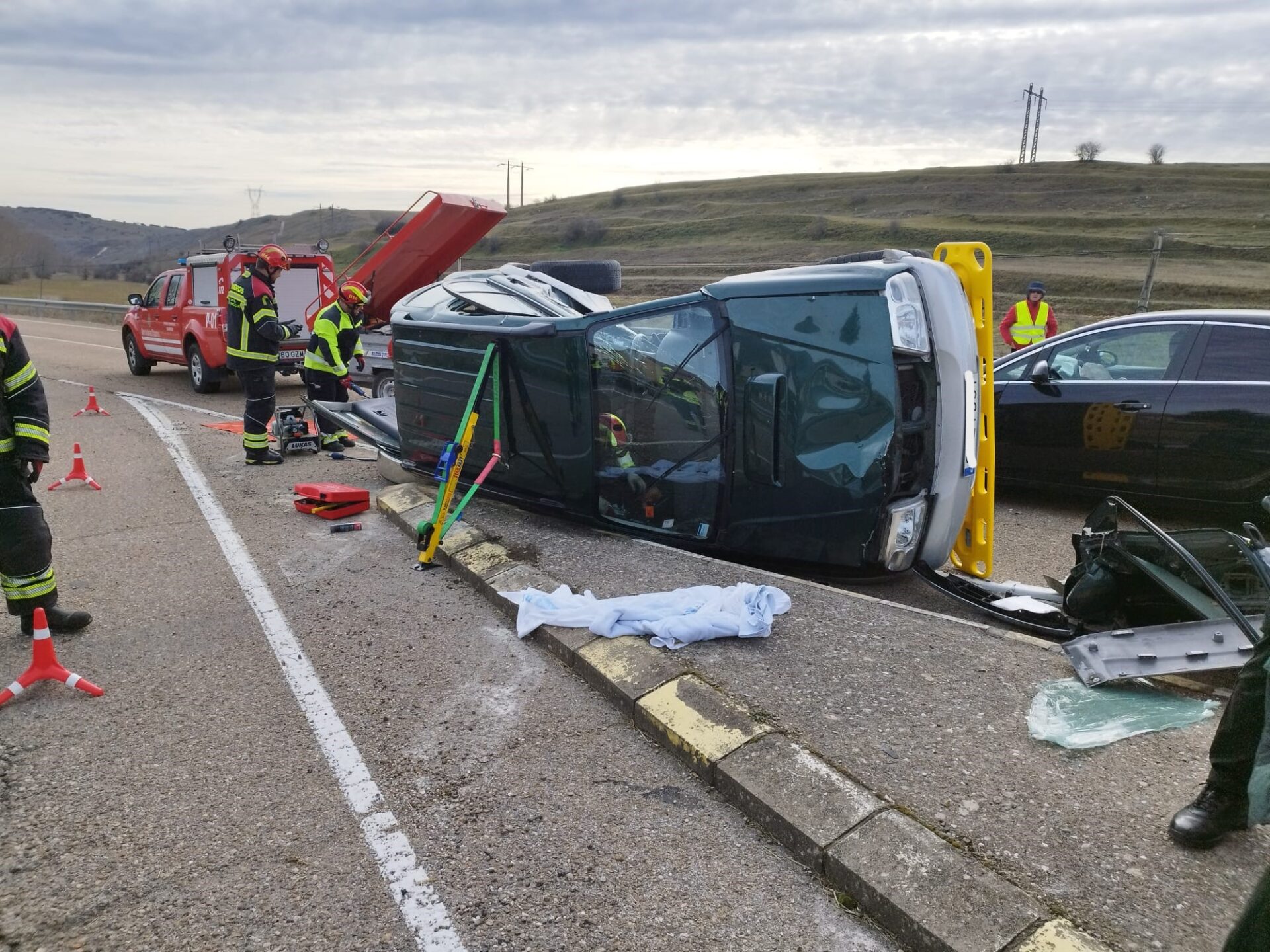 Hasta el lugar de los hechos se desplazaron los Parques de Bomberos Comarcales de Guardo, y por protocolo, también el de Saldaña, que movilizó su furgón de útiles especializado en accidentes de tráfico. Fue necesario apuntalar el vehículo así como excarcelar al único ocupante del vehículo, dado que las puertas habían quedado bloqueadas a causa del impacto y la deformación del chasis, explicaron los Bomberos de Guardo.