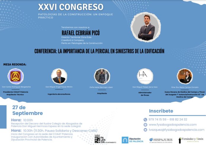 En esta edición se contará con Rafael Cebrián Picó, director territorial Zona Este de Crawford & Company, como ponente principal, y una mesa redonda presidida por la directora de Fernández y Simón Abogados, Soledad Fernández Simón, en la que participan: Marta Campo Gonzalo, jueza decana de Medina del Campo; Carlos Rodríguez Bergareche, presidente del COAAT Palencia; Miguel Ángel Navas Martín, ingeniero industrial; Isabel Bermejo López, arquitecta; y, Miguel Peláez de la Hera, administrador de fincas.