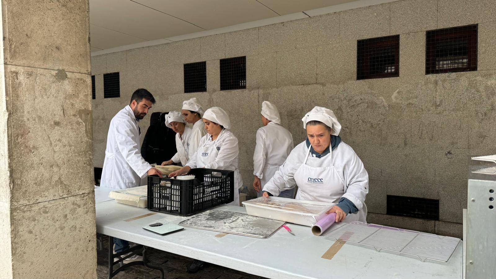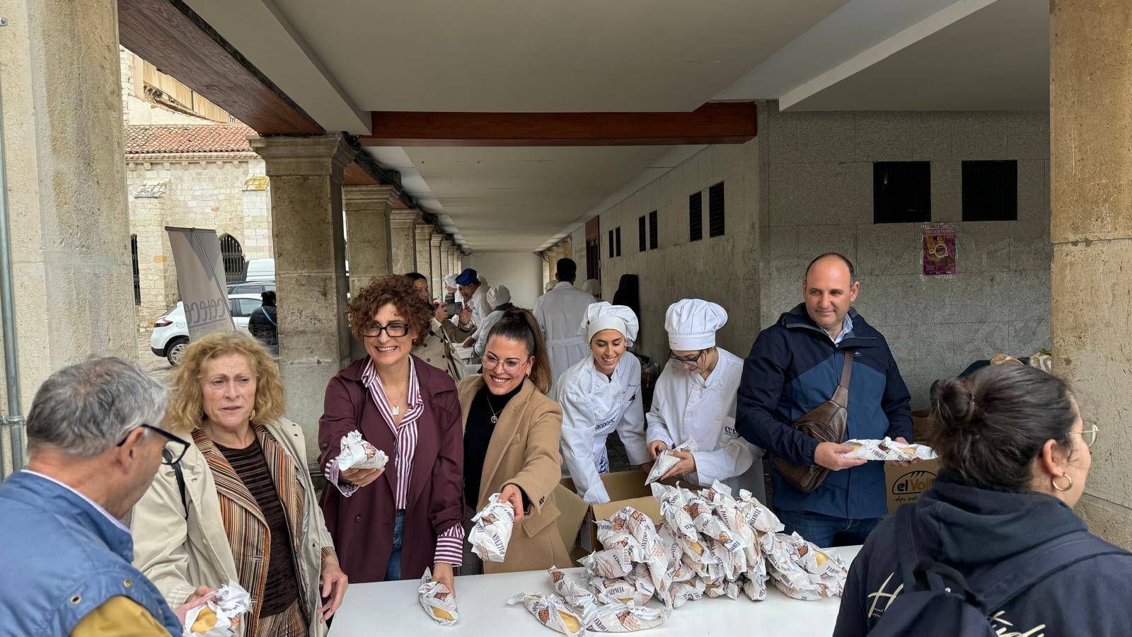 Un reparto popular en el que participó la alcaldesa, Miriam Andrés, junto a los concejales Judith Castro y Rosario García, o el diputado provincial y alcalde de Grijota, Jesús Tapia, en plena Plaza Mayor, donde además alumnos y profesionales del Cetece estuvieron ofreciendo un taller de elaboración de pan artesano.