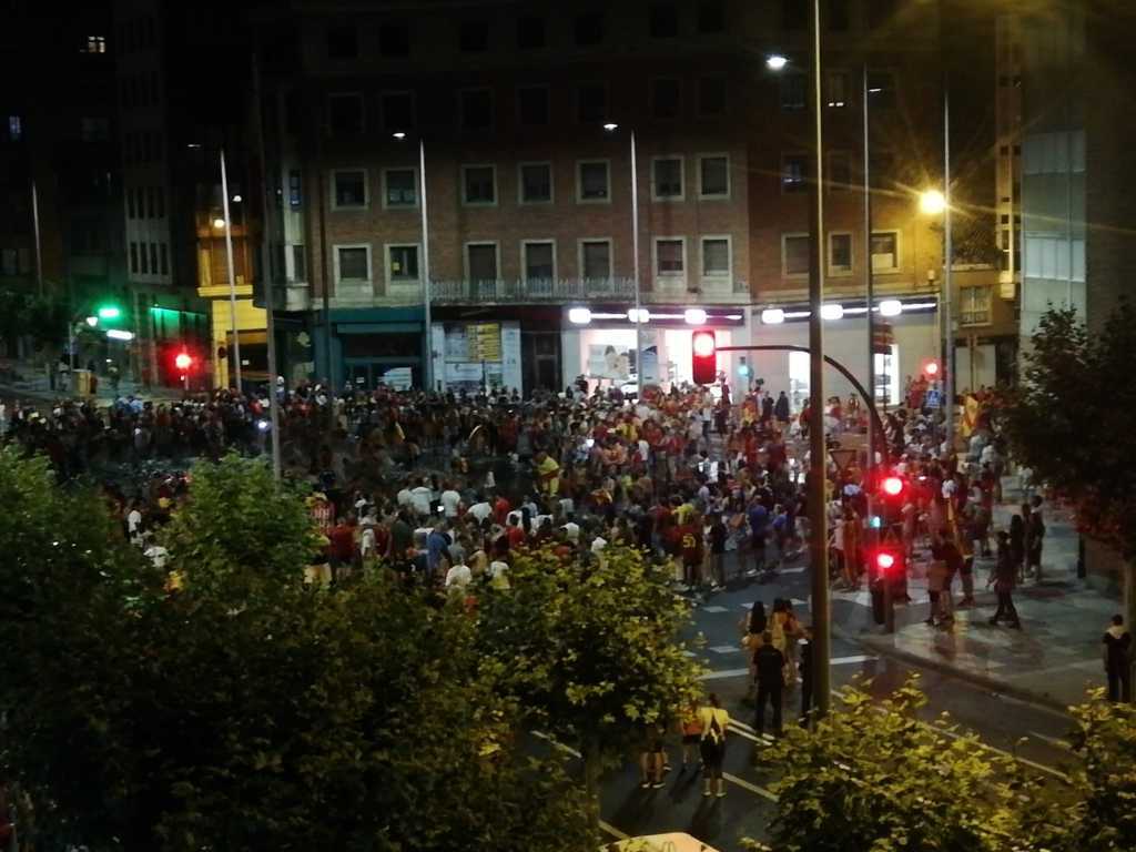 Tras el pitido final, la celebración no ha terminado. La marea de aficionados comienza a desplazarse hacia la Plaza España, continuando la fiesta.