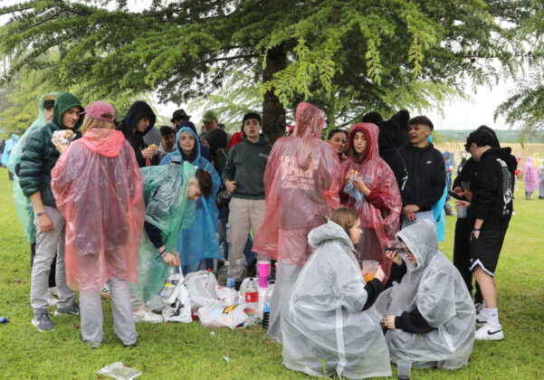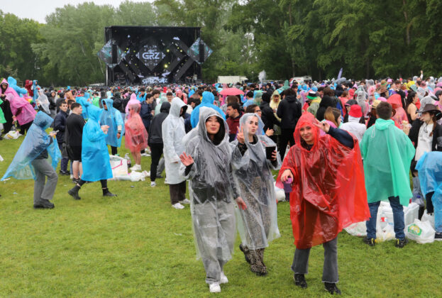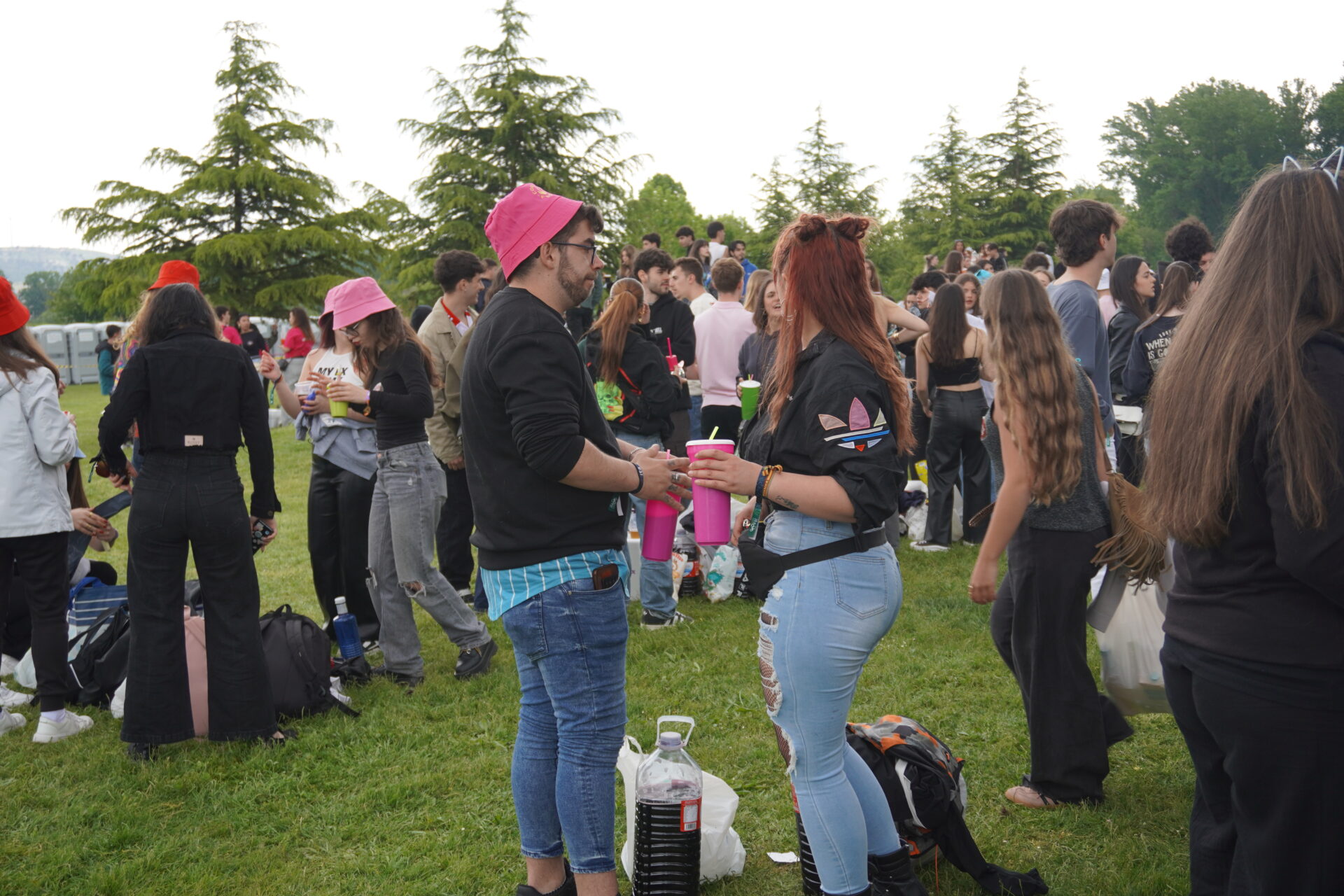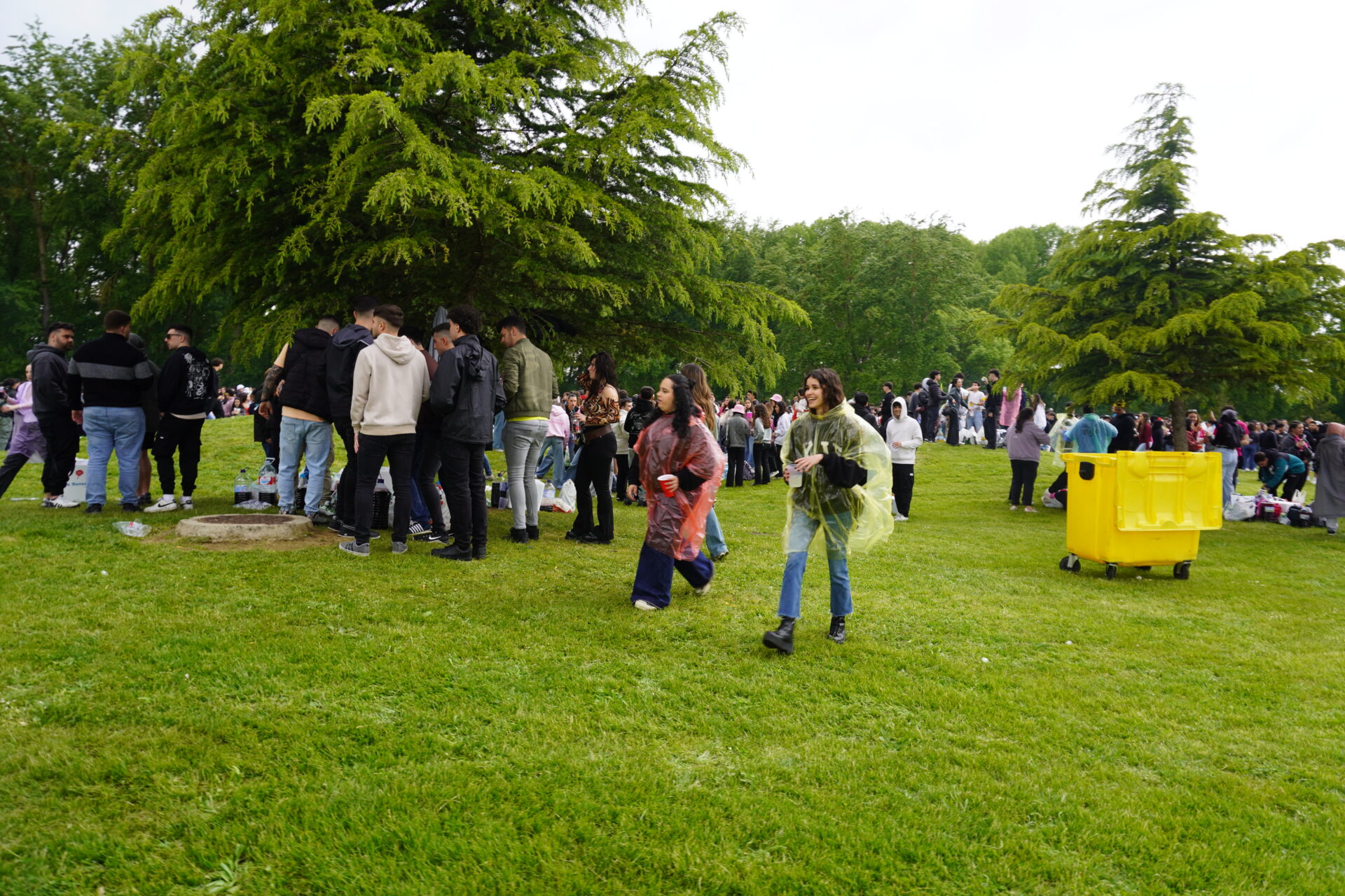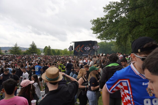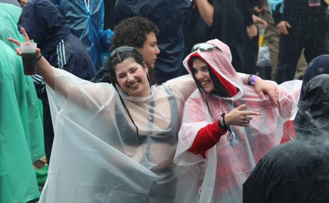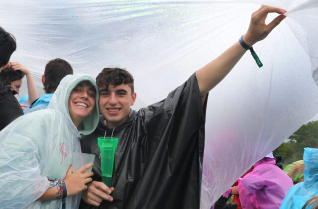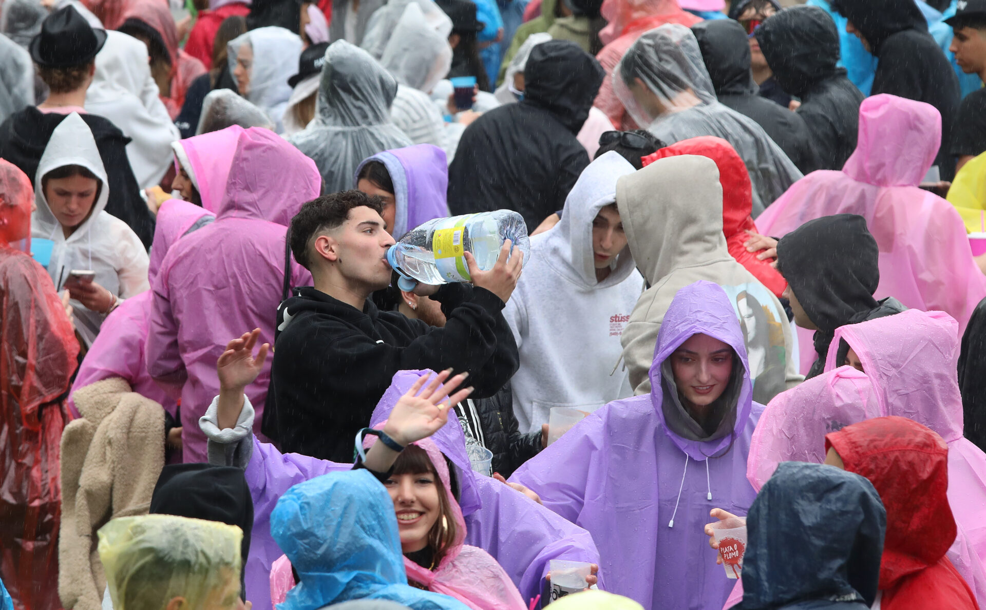 Sea como fuera, la lluvia comenzó a caer con fuerza. Pero no restó aplomo a los miles de personas que ya estaban en el parque palentino. Abrieron la mochila, la riñonera o la bolsa con los hielos, sacaron el poncho. Muchos, la mayoría, se parapetaron bajo el plástico, creado una especie de fiesta Holi, pero sin polvos de colores.