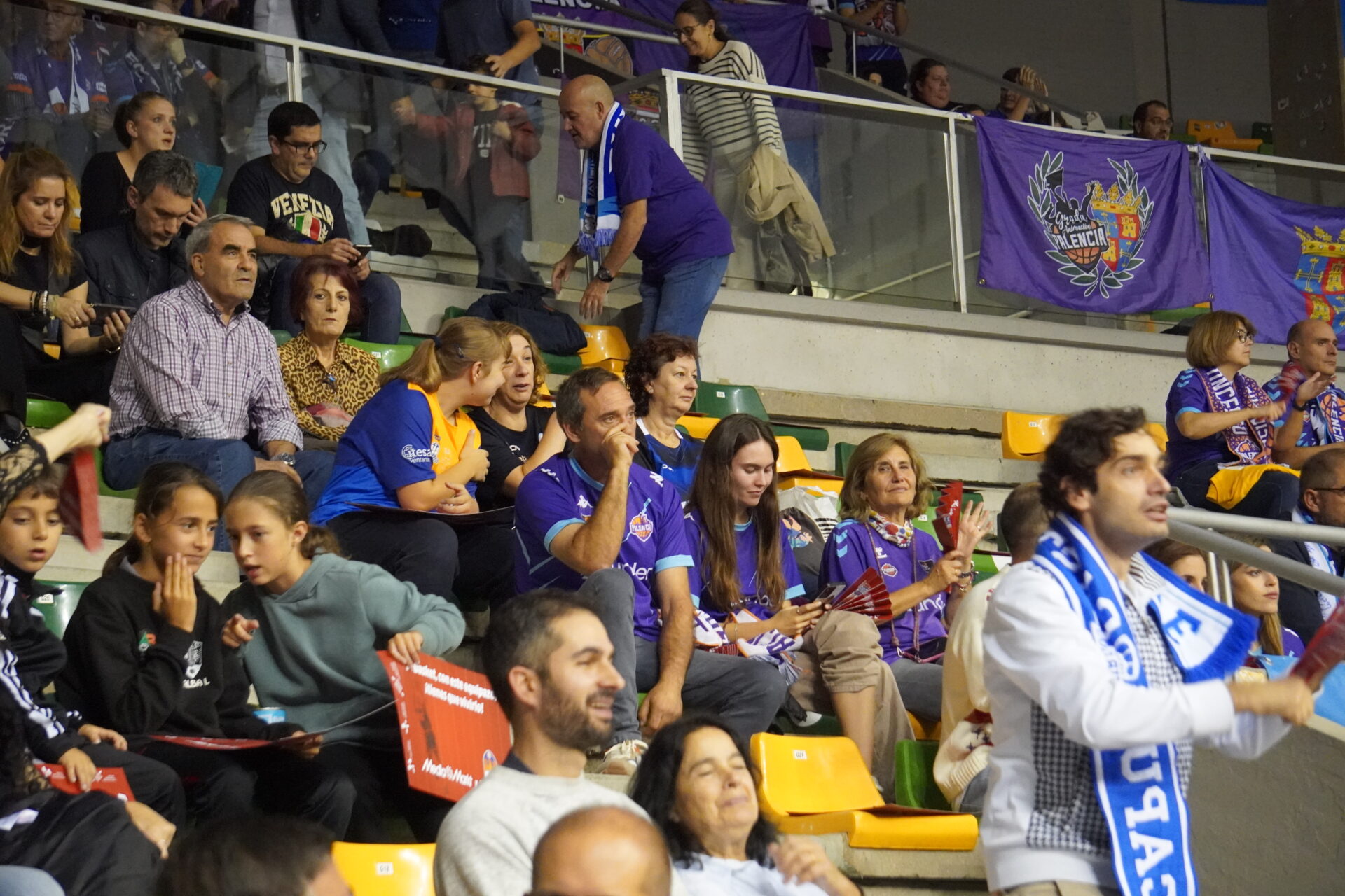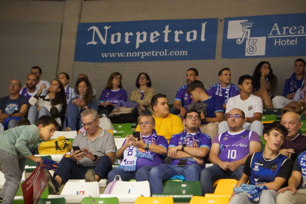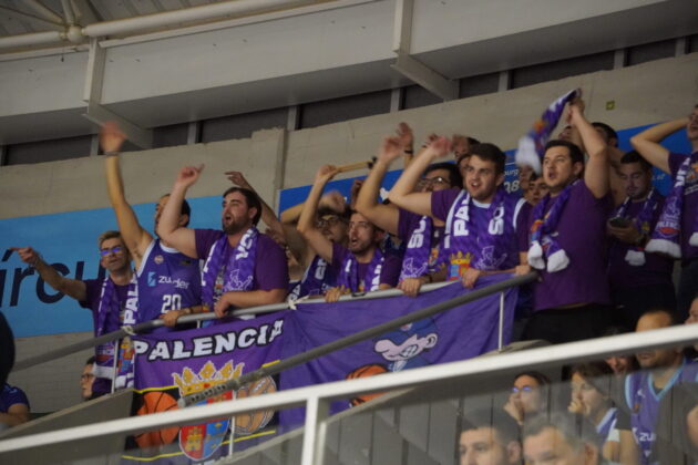 Varios centenares de palentinos se desplazaron a la capital del Cid para acompañar al Palencia Baloncesto y en ocasiones llegaron a superar en decibelios a la hinchada local