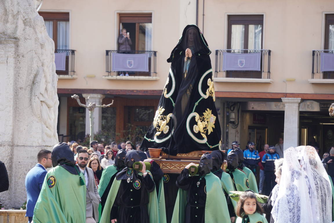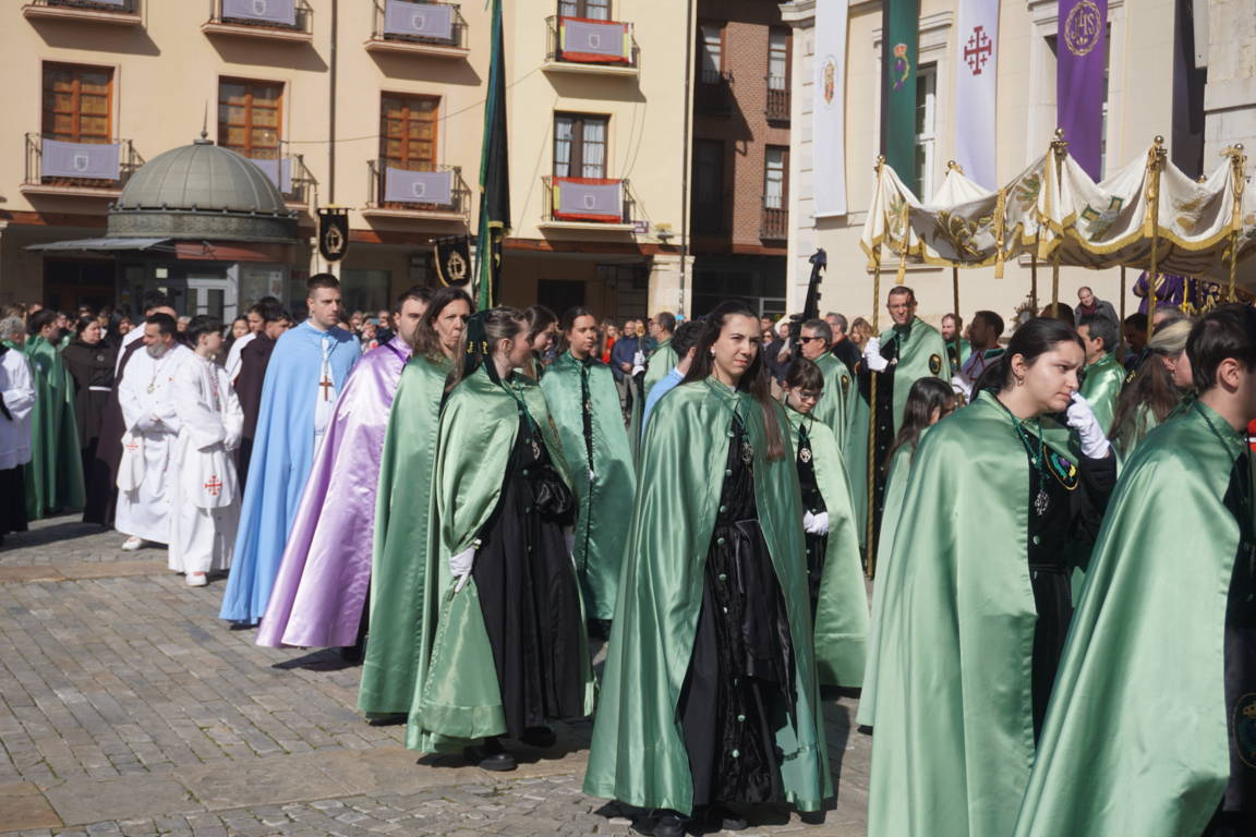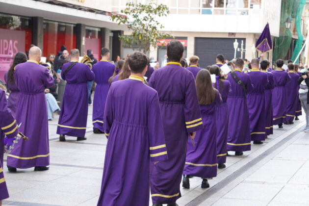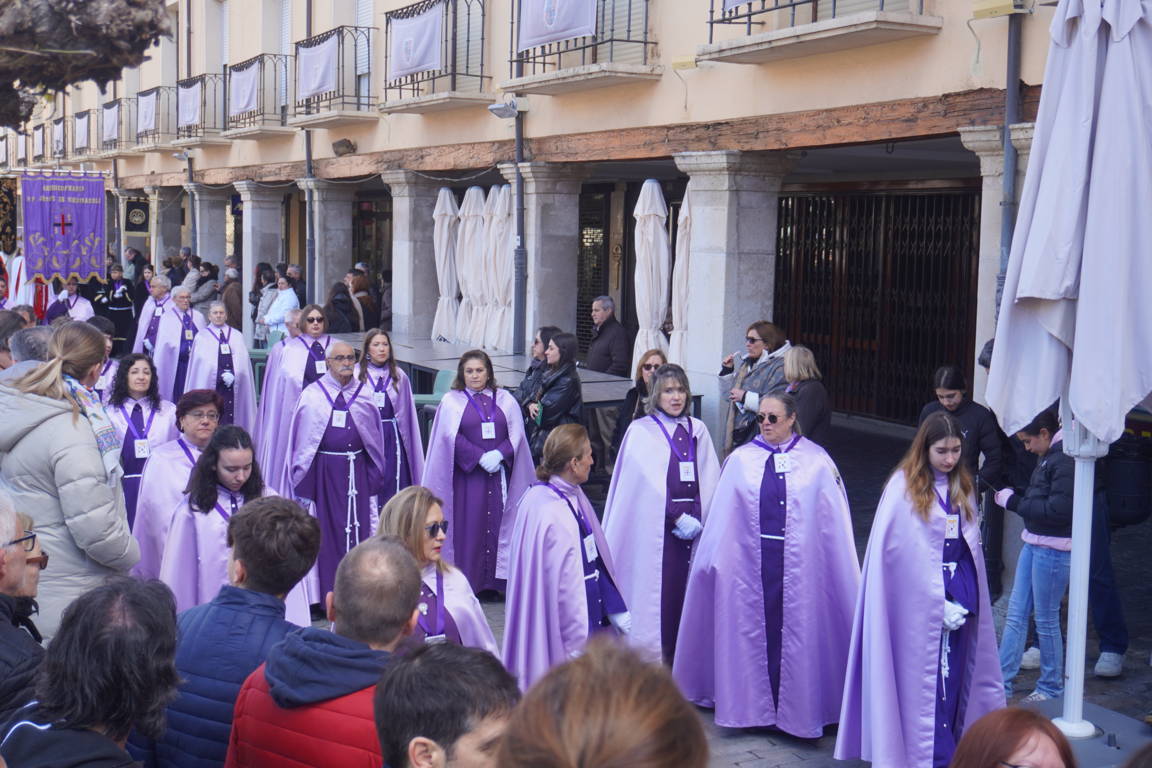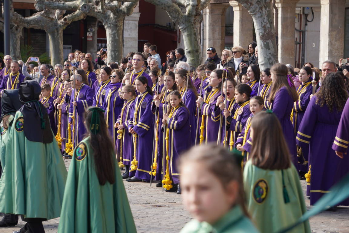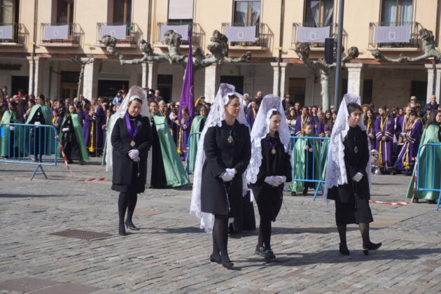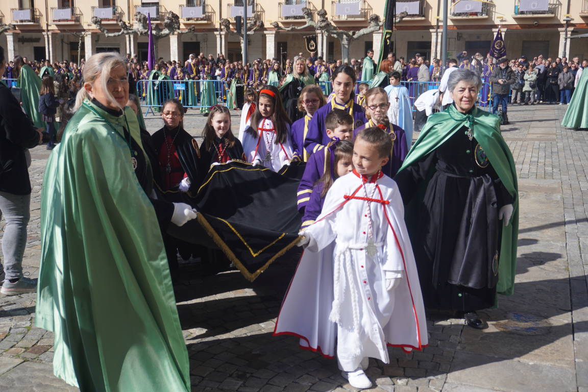 Tan mañanera es esta procesión que los bostezos saltaban por las filas de cofrades aquí y allá, a la vista dado que hoy, salvo los que portaban a la Virgen de la cofradía de la Vera Cruz, iban descubiertos. Se acabó la penitencia. Hasta para los portadores de la talla, que una vez fue despojada ya en la plaza Mayor de su velo negro por dos niños de la Vera Cruz, organizadora del desfile, también se despojaron de sus verdugos.