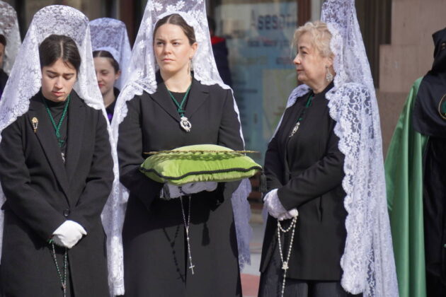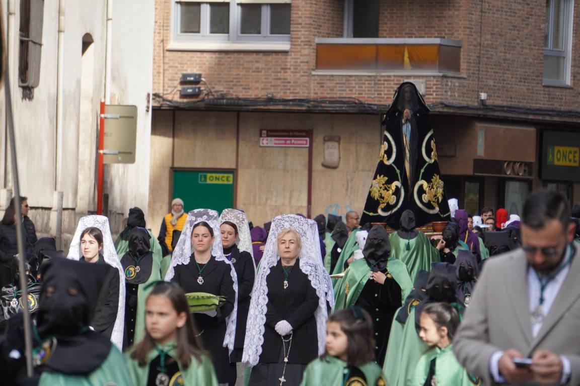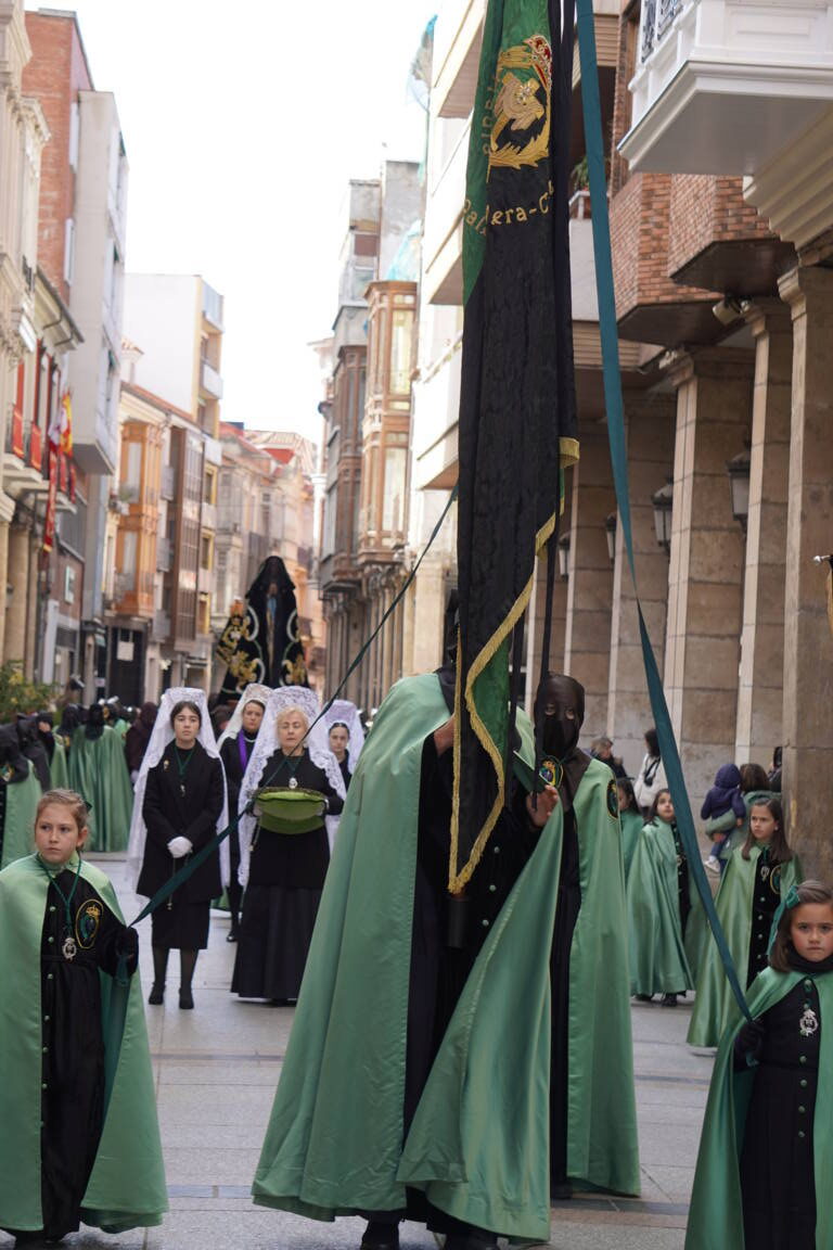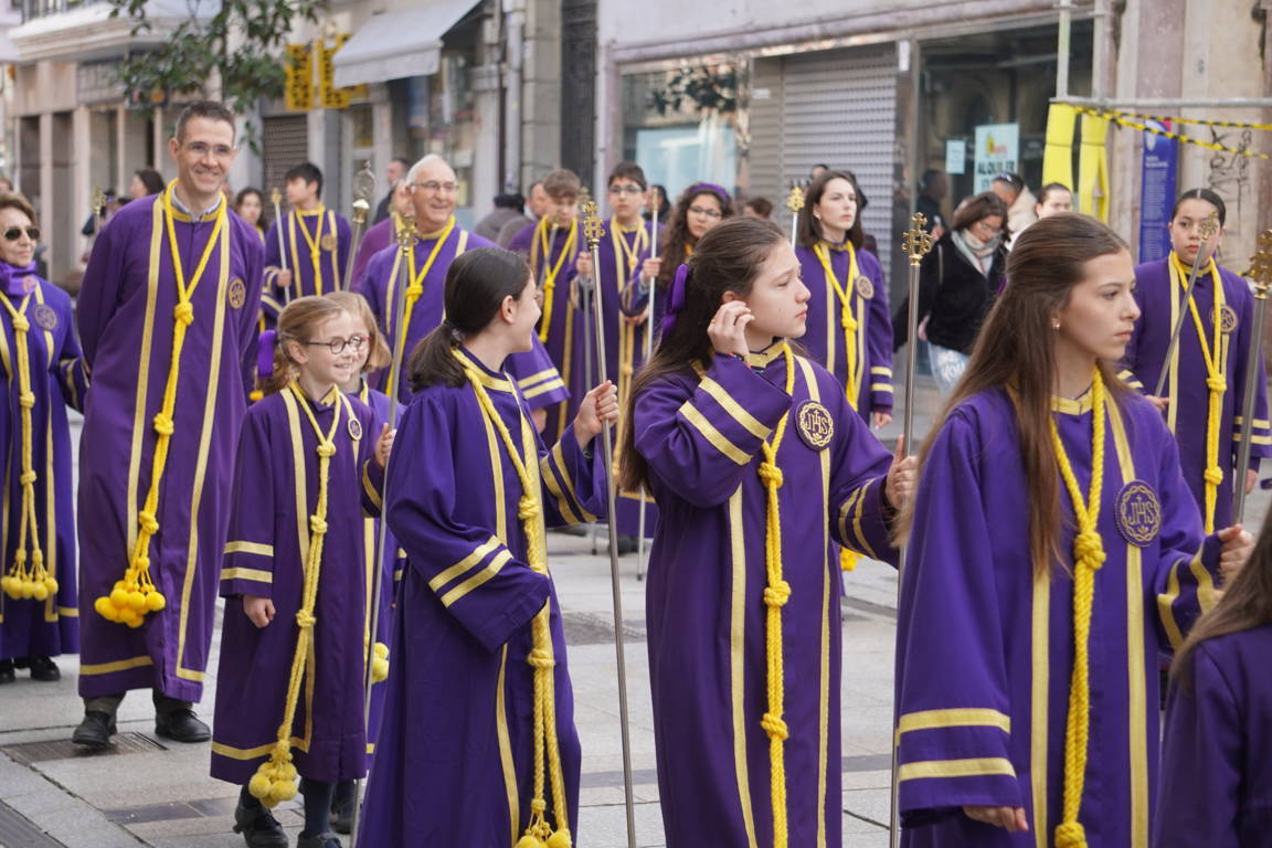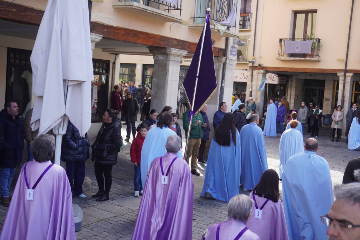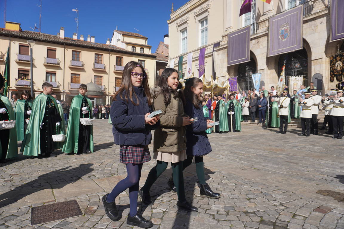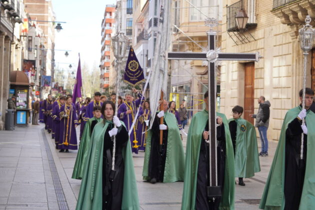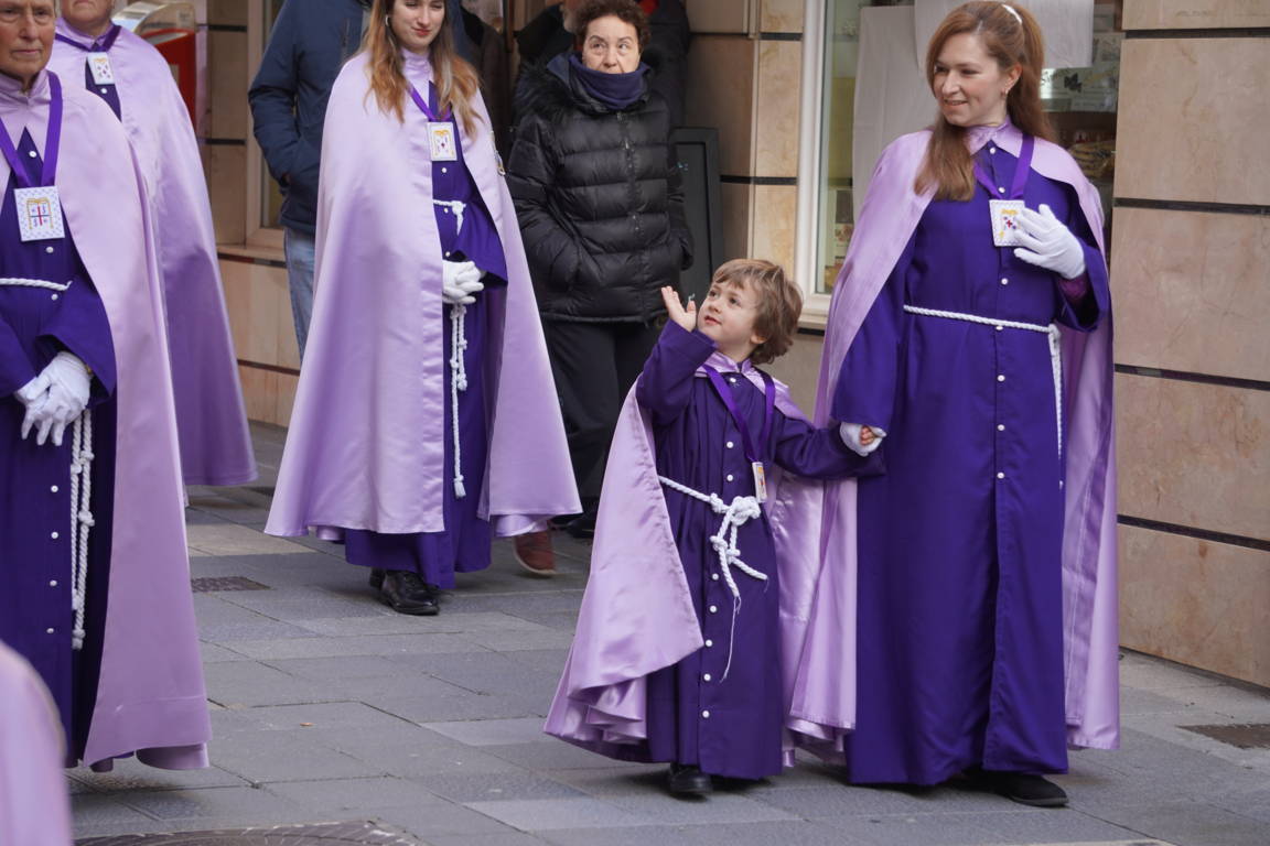 Tan mañanera es esta procesión que los bostezos saltaban por las filas de cofrades aquí y allá, a la vista dado que hoy, salvo los que portaban a la Virgen de la cofradía de la Vera Cruz, iban descubiertos. Se acabó la penitencia. Hasta para los portadores de la talla, que una vez fue despojada ya en la plaza Mayor de su velo negro por dos niños de la Vera Cruz, organizadora del desfile, también se despojaron de sus verdugos.