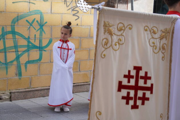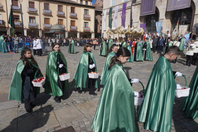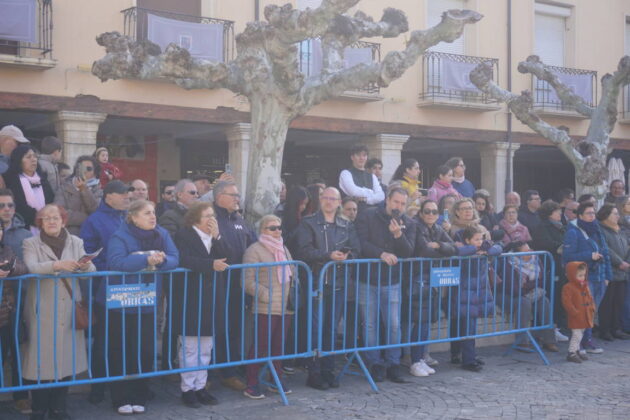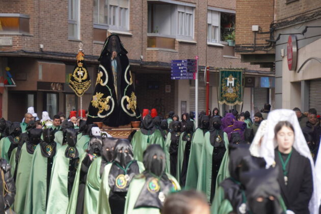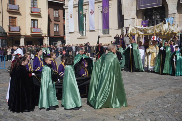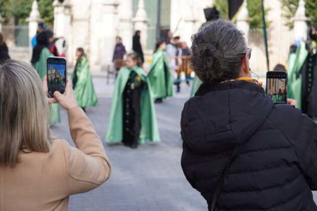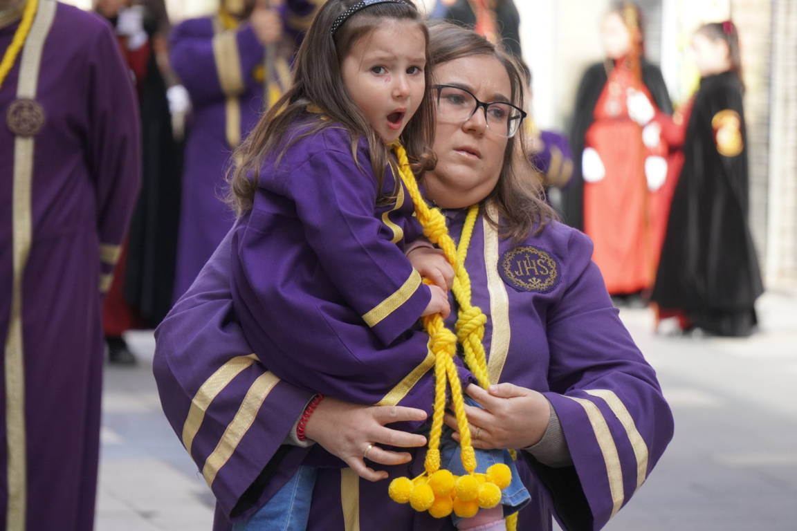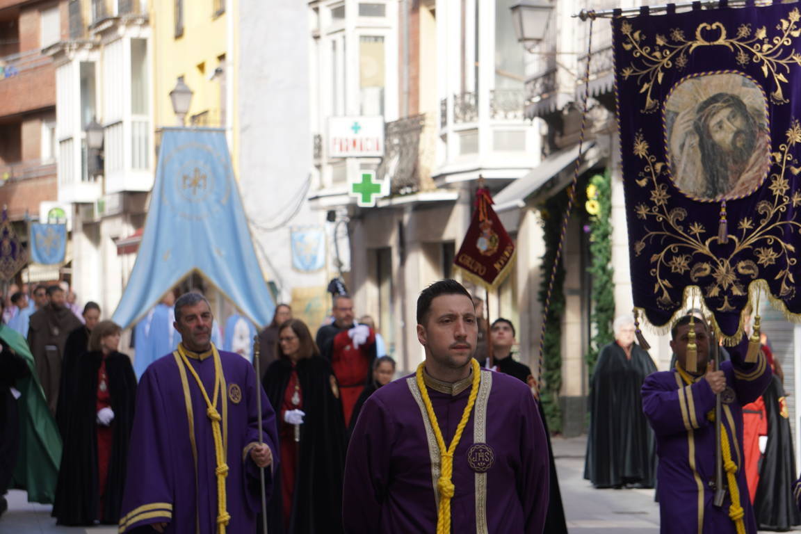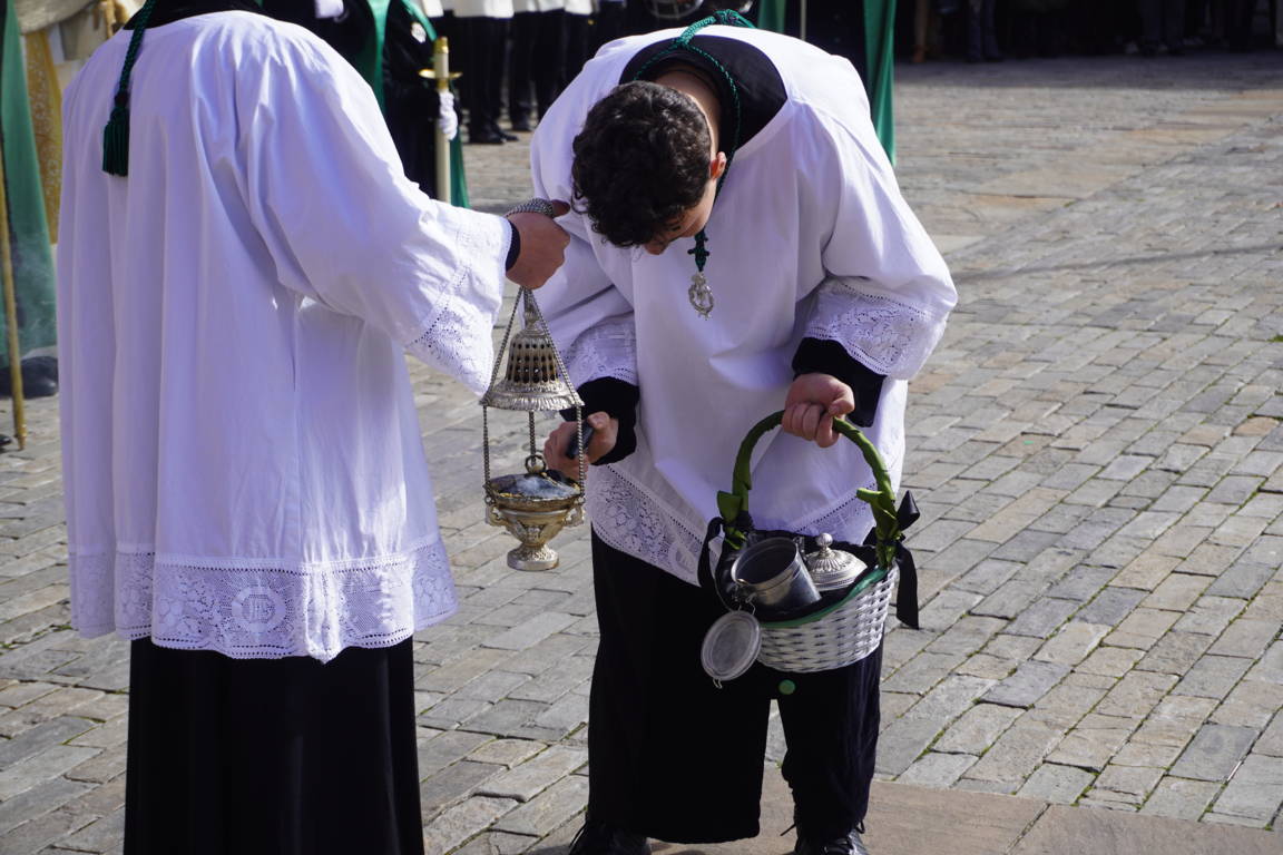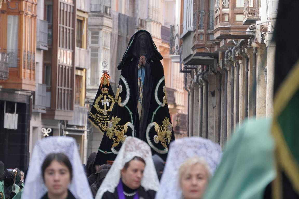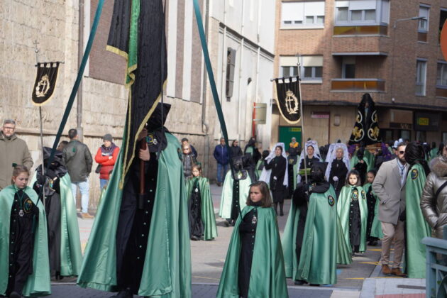 Tan mañanera es esta procesión que los bostezos saltaban por las filas de cofrades aquí y allá, a la vista dado que hoy, salvo los que portaban a la Virgen de la cofradía de la Vera Cruz, iban descubiertos. Se acabó la penitencia. Hasta para los portadores de la talla, que una vez fue despojada ya en la plaza Mayor de su velo negro por dos niños de la Vera Cruz, organizadora del desfile, también se despojaron de sus verdugos.