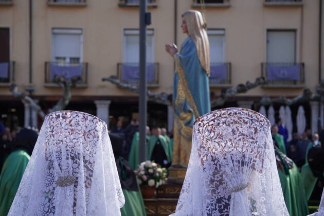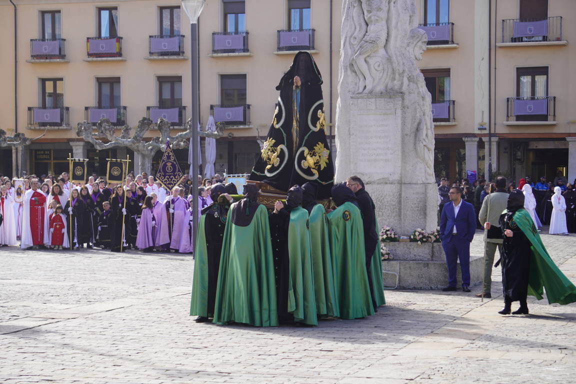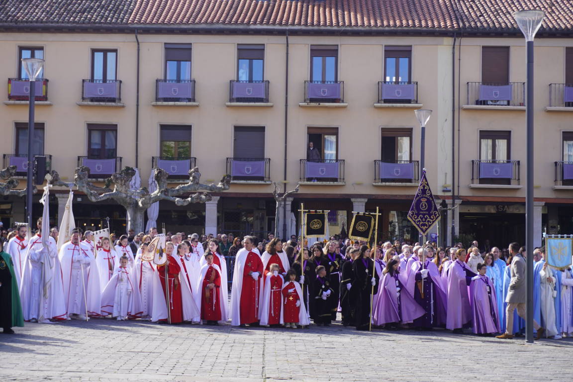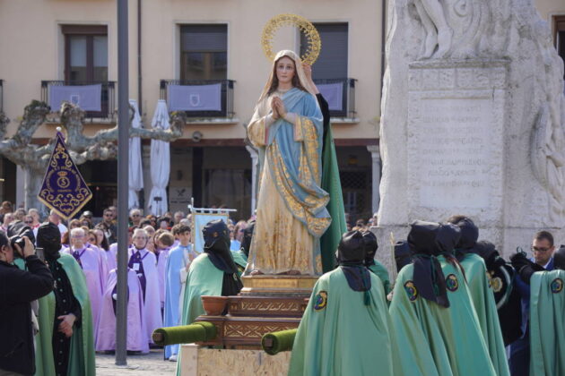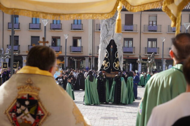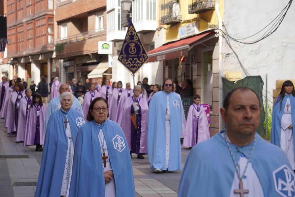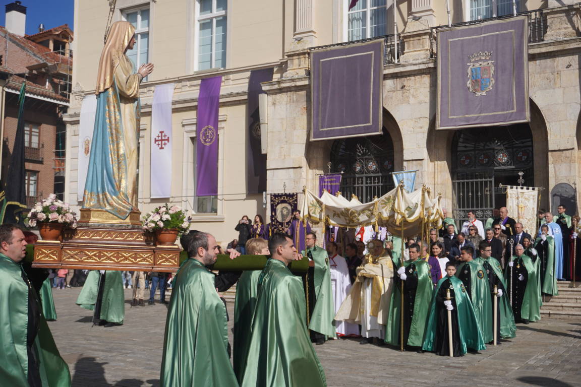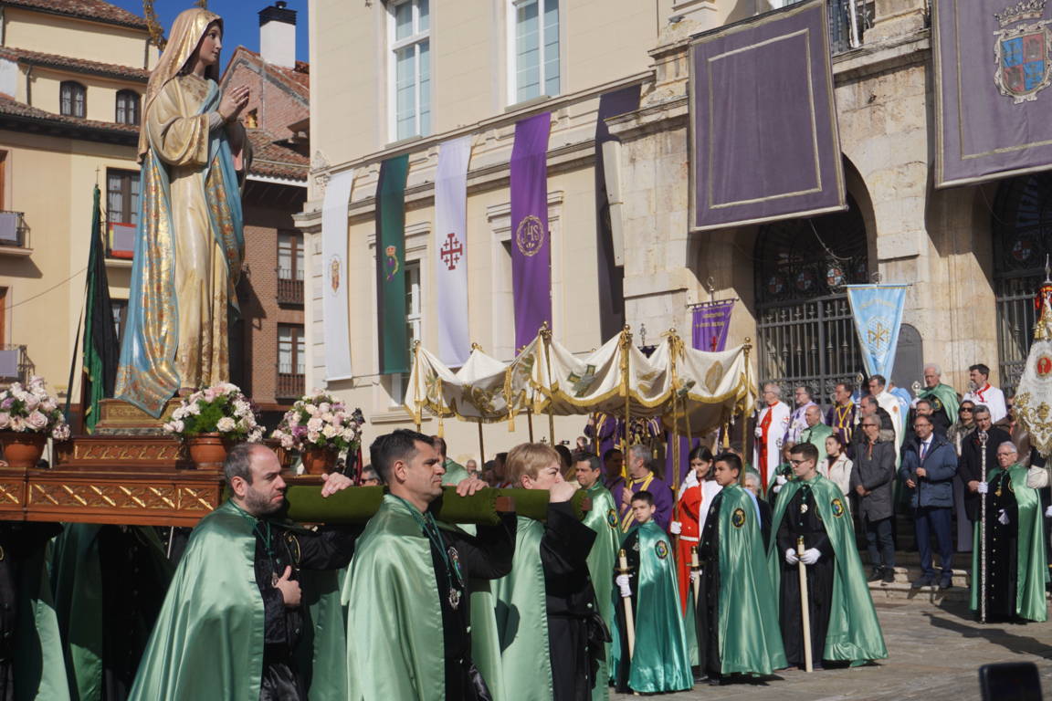 La más temprana de todas las que durante la Semana Santa recorren las calles de la capital palentina y de las pocas que este año se han salvado de la lluvia y que además han gozado de la claridad del cielo. Es como si el Domingo de Resurrección le quitara el velo no solo a la virgen, sino también al cielo para que el sol brillara mientras los cofrades palentinos acompañaban al Santísimo bajo palio al encuentro con la Virgen del Rompimiento (Anónimo, de 1929) para hacer partícipe de su resurrección.