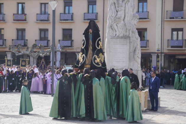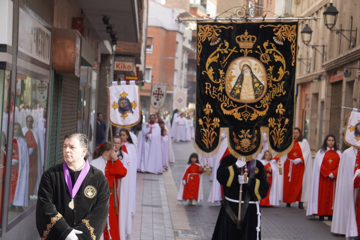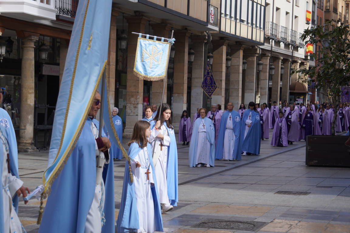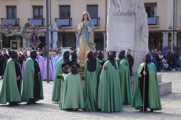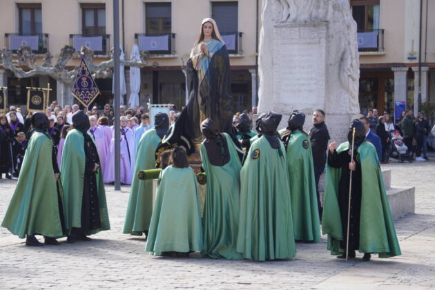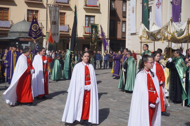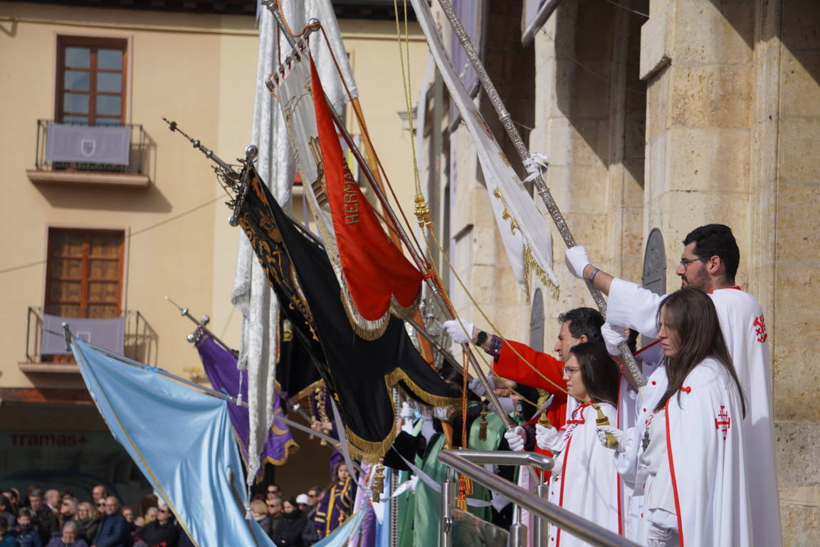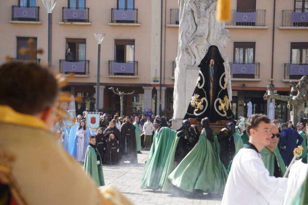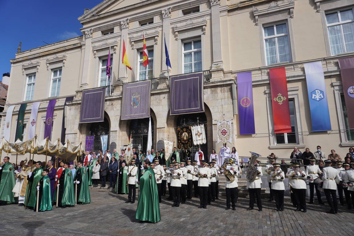 La más temprana de todas las que durante la Semana Santa recorren las calles de la capital palentina y de las pocas que este año se han salvado de la lluvia y que además han gozado de la claridad del cielo. Es como si el Domingo de Resurrección le quitara el velo no solo a la virgen, sino también al cielo para que el sol brillara mientras los cofrades palentinos acompañaban al Santísimo bajo palio al encuentro con la Virgen del Rompimiento (Anónimo, de 1929) para hacer partícipe de su resurrección.