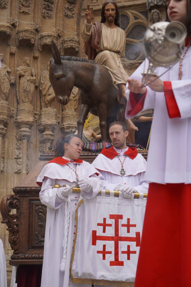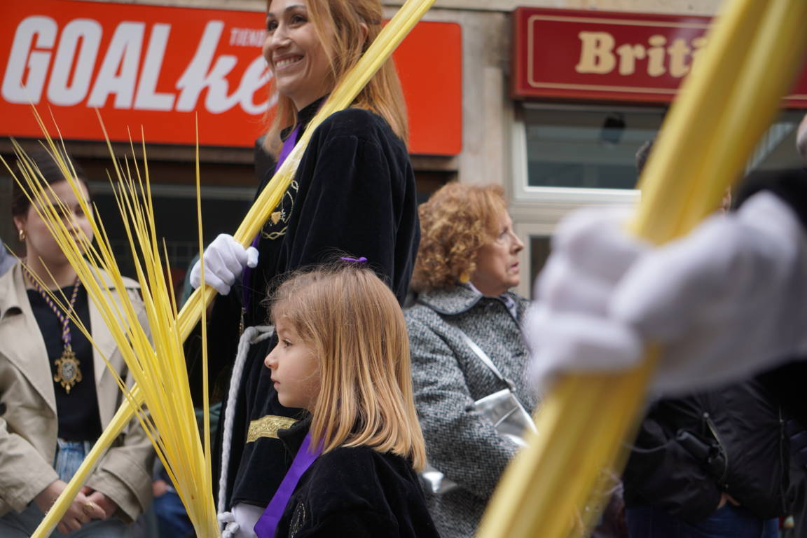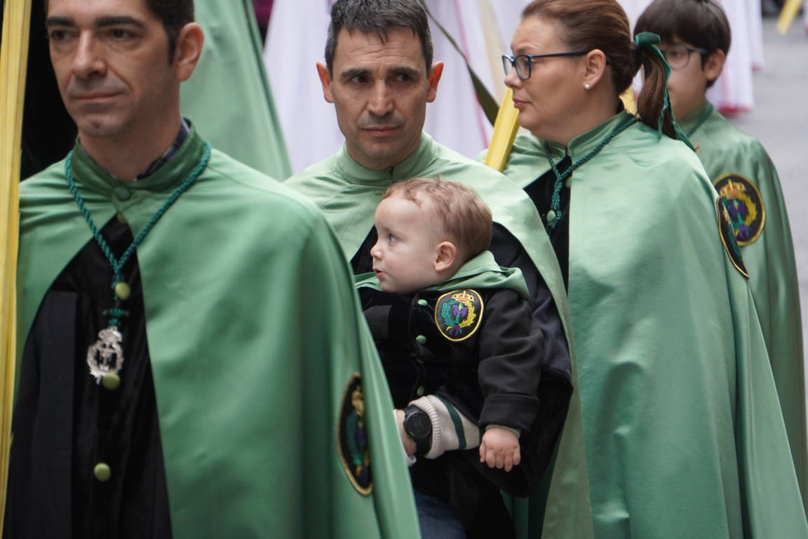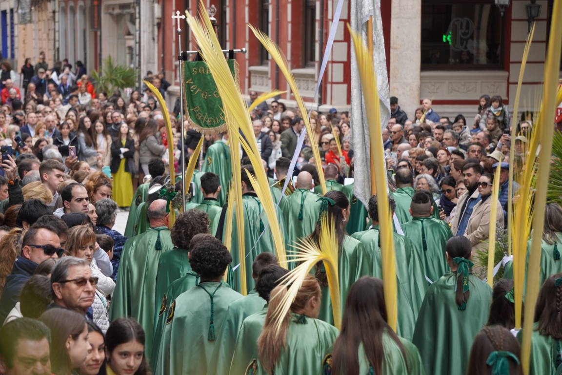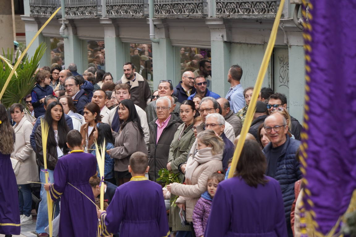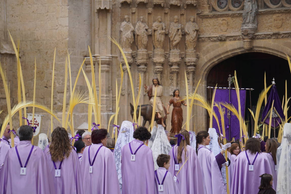 La de La Borriquilla, por ese carácter especial, triunfante, emulando la triunfal entrada de Jesús en Jerusalén, congrega a miles de cofrades. De todas las edades, a cara descubierta aún. Eso provocó que desde que el primer cofrade salió de la plaza de la Inmaculada hasta que La Borriquilla echó a rodar pasaran cerca de 35 minutos. Tiempo en el que las palmas batían ante la Catedral.