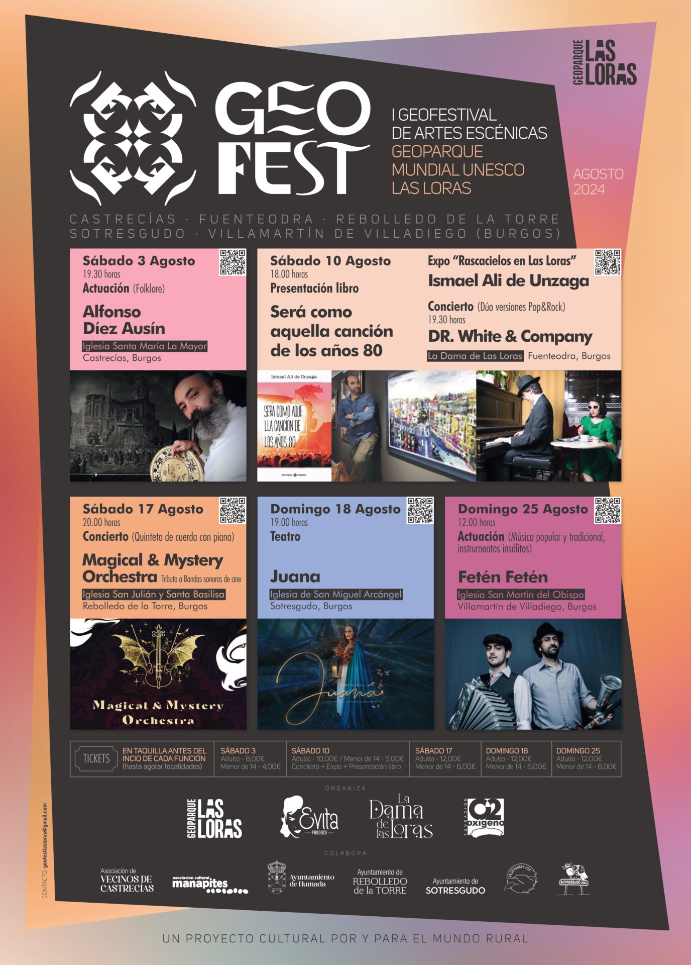 El Geoparque Mundial Unesco Las Loras se prepara para recibir la primera edición del Geo Fest, un festival de artes escénicas que ‘transformará’ las iglesias de Castrecías, Fuenteodra, Rebolledo de la Torre, Sotresgudo y Villamartín de Villadiego en escenarios culturales durante el mes de agosto. La iniciativa, impulsada por el palentino Javier Maisterra y la burgalesa Eva Manjón, busca ofrecer una alternativa cultural de calidad en el medio rural y destacar el patrimonio cultural de la región.