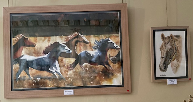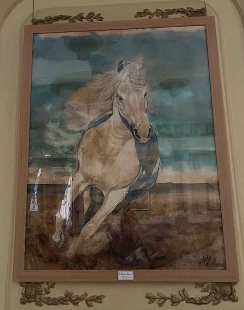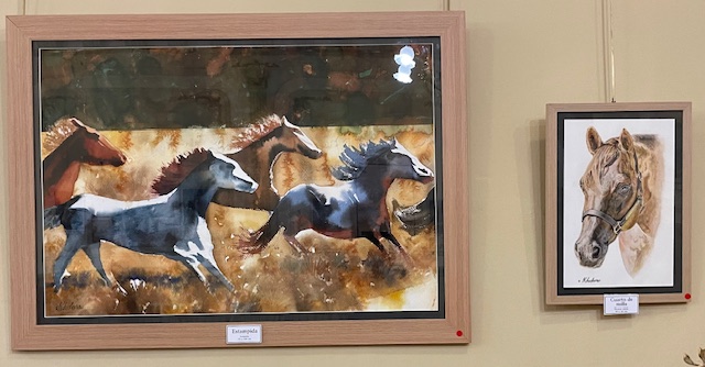 El cuadro ‘Libre / Free’, de grandes dimensiones retrata a un dinámico caballo de cuerpo entero, de un hermoso color blanquecino en pleno movimiento del galope, con la crin volando, en un entorno paisajístico estructurado por la tierra marrón y el cielo azulado. La técnica mixta de esta obra apunta también a una textura suave, como la piel de los animales. Dinamismo y movimiento se logra también en ‘Estampida’, con un grupo de caballos desbocados desplazándose de izquierda a derecha del espectador. En ambos casos, el caballo simboliza la libertad con la que se mueve por el campo.