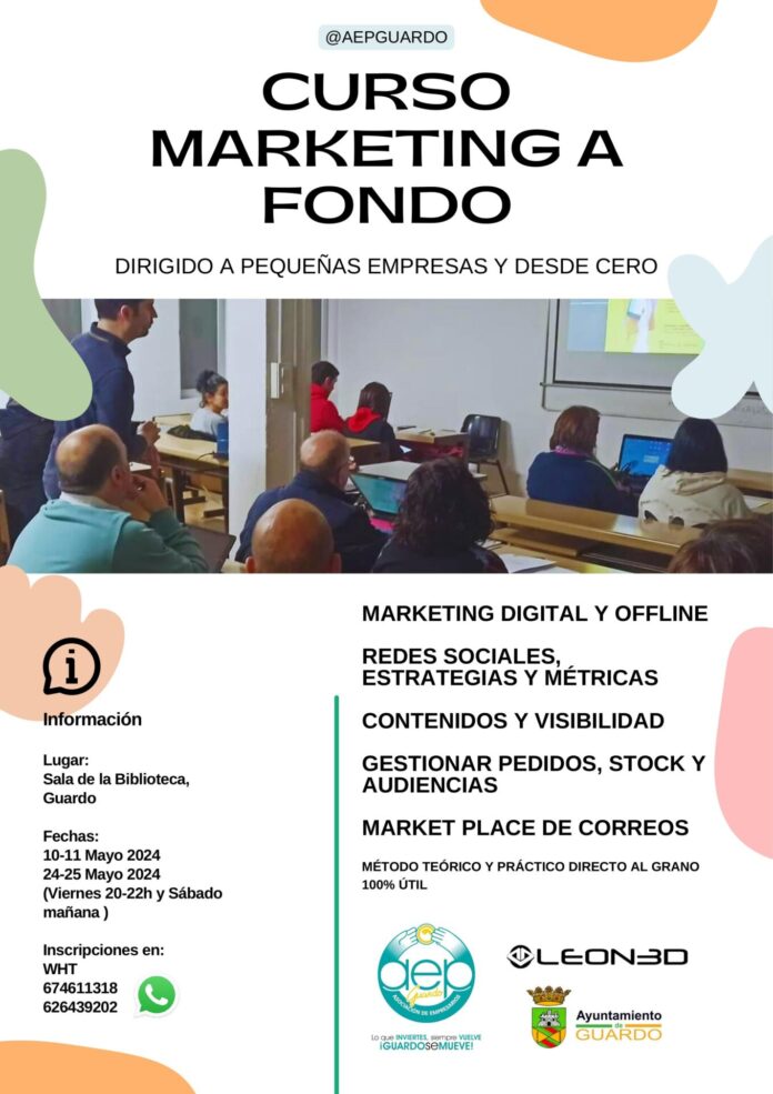 Como continuidad de la formación desarrollada el pasado mes de enero, “Como vender online con éxito desde cero – Guardo Mercado Local Online”, ha organizado, en colaboración con la Asociación de Empresarios y Profesionales de Guardo, un Curso financiado íntegramente por el Ayuntamiento de Guardo, destinado a pequeñas empresas y profesionales, que podrán seguirlo sin ningún coste, bajo el título “Curso Marketing a Fondo”, durante los días 10, 11, 24 y 25 de mayo, en la Sala de Formación de la Biblioteca de Guardo, cedida por el Ayuntamiento para tal fin.