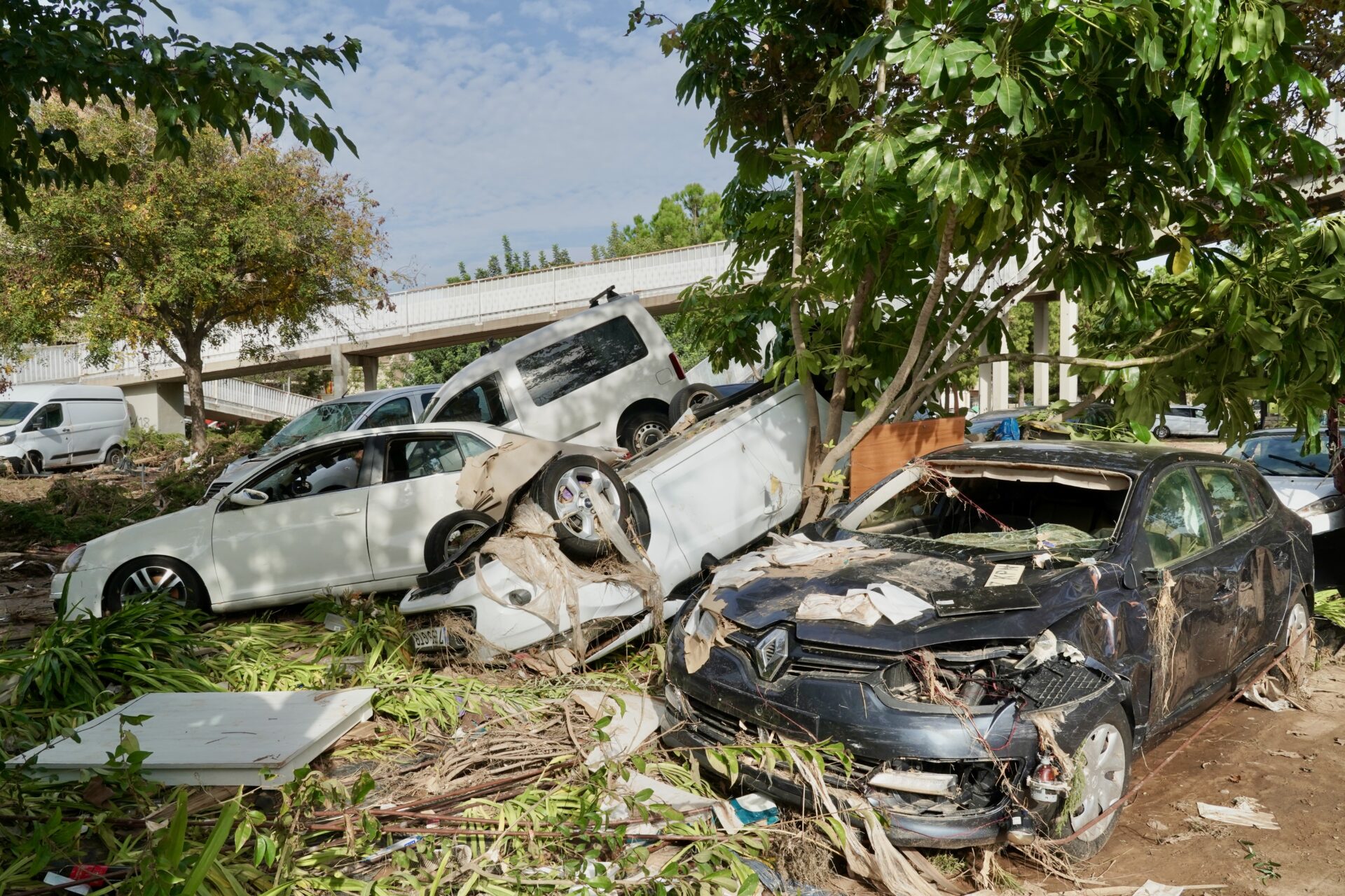 Unos pasos más hacia las vías del tren, descolocadas por el paso del agua, permiten observar un parque infantil en el que, por sorprendente que parezca, juega una niña, quizás símbolo de la esperanza a la que se enfrenta esta tierra. Desde allí, tras el fango, trabaja otro equipo con cestos, palas y cepillos, y otros preguntan dónde pueden ayudar, mientras pasan por delante de coches volcados y vehículos semienterrados, en una imagen que parece postapocalíptica, donde un hombre y una mujer pasen a sus pequeños perros. Se detienen, frente a la niña. Y ella le pregunta a él: “¿Qué tal lo llevas?”. En valenciano, él le devuelve la respuesta y le dice que “mejor que el animal, que está muy raro”. Y ella, finaliza: “Cómo todos nosotros”.