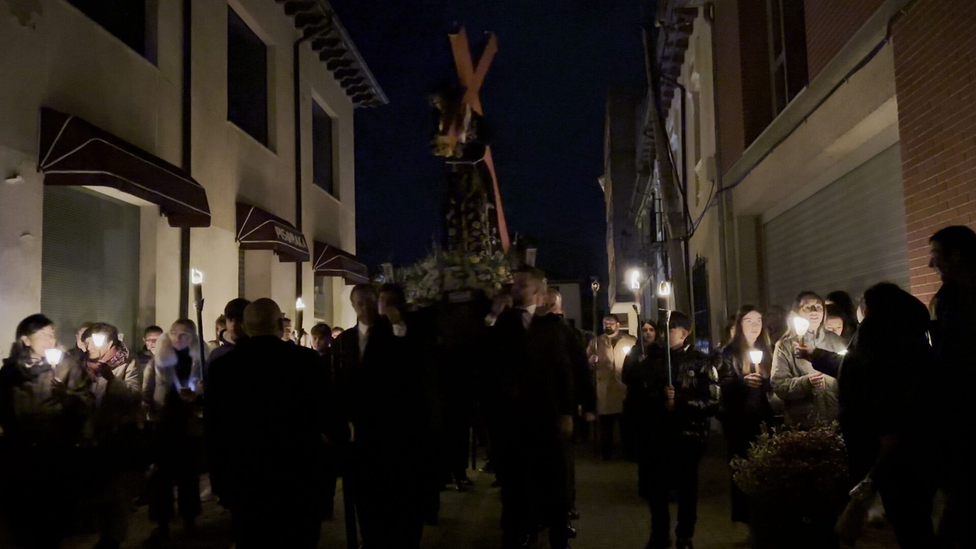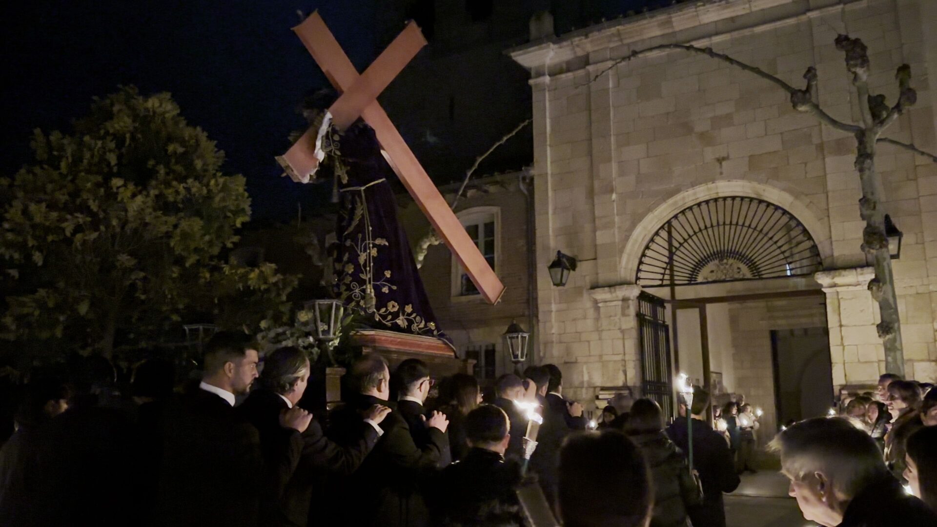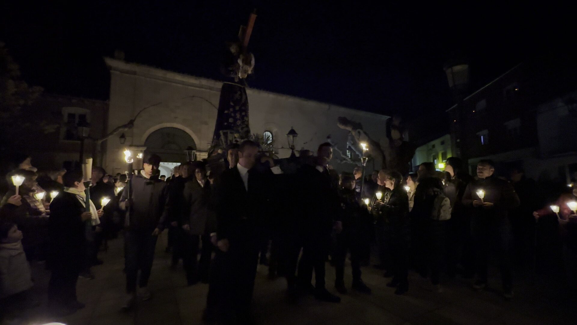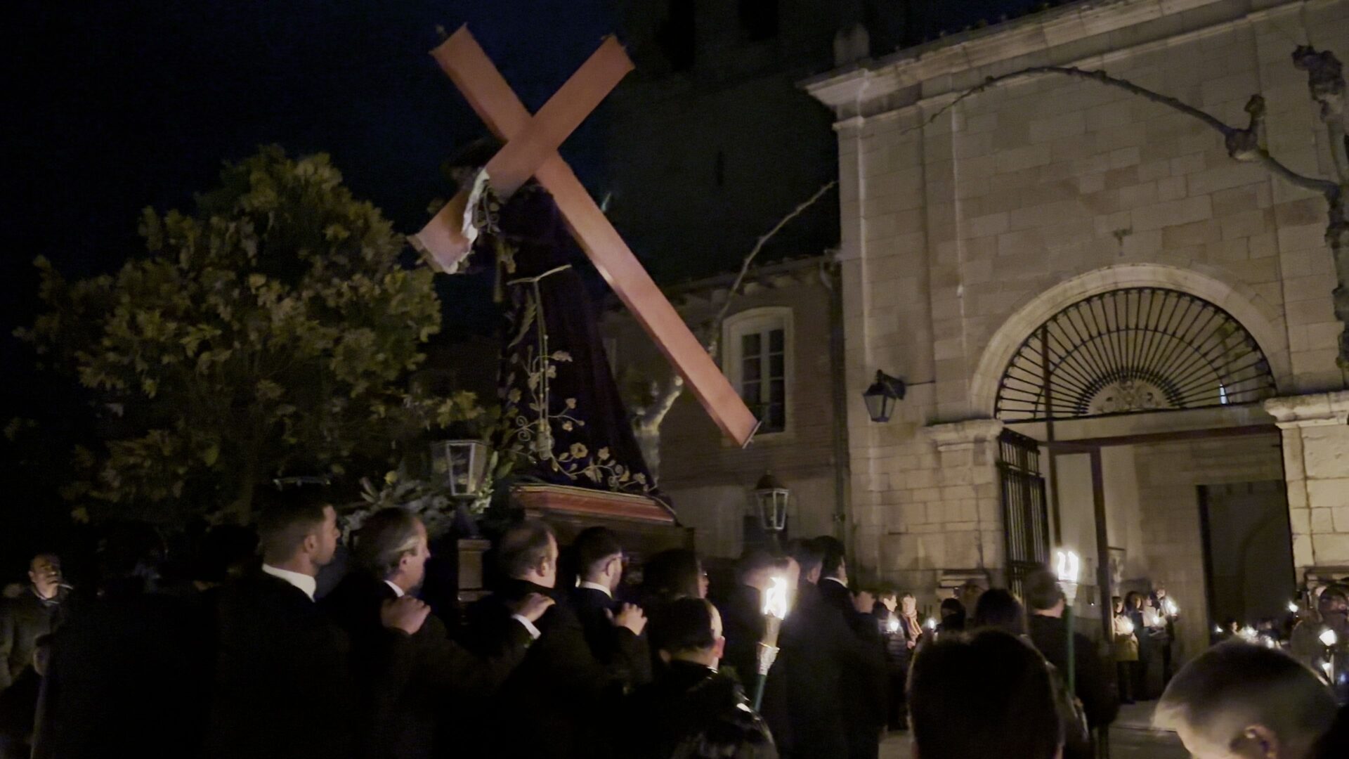 En el pórtico de la Iglesia, el Nazareno era esperado por 100 velas coloreadas por los niños de Herrera y flanqueado por porteadores de antorchas, mientras cientos de personas encendían sus velas para comenzar un recorrido por las calles de una ciudad a oscuras, en la que bares y establecimientos apagaban la luz a su paso y donde el profundo y respetuoso silencio era acompañado por la Banda de Cornetas y Tambores de la Santísima Trinidad con sus cerca de 90 componentes.