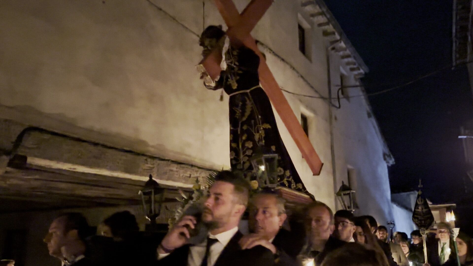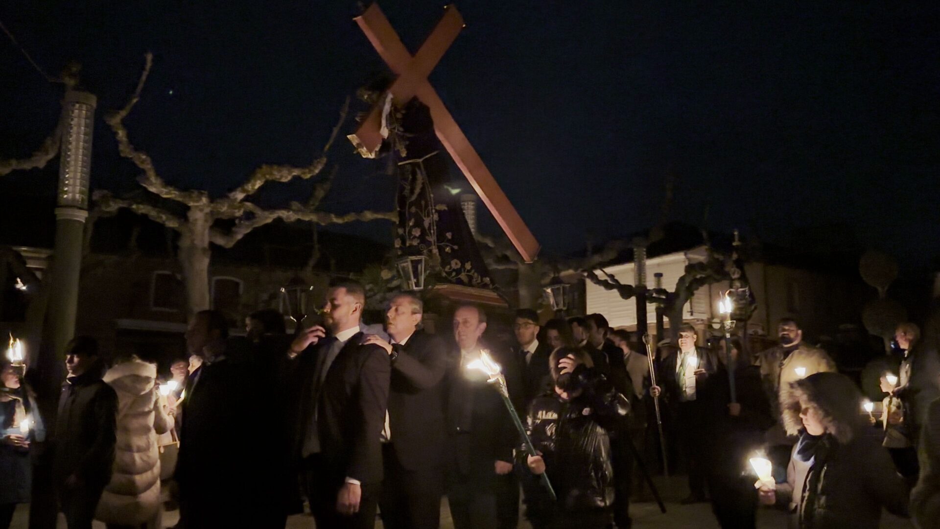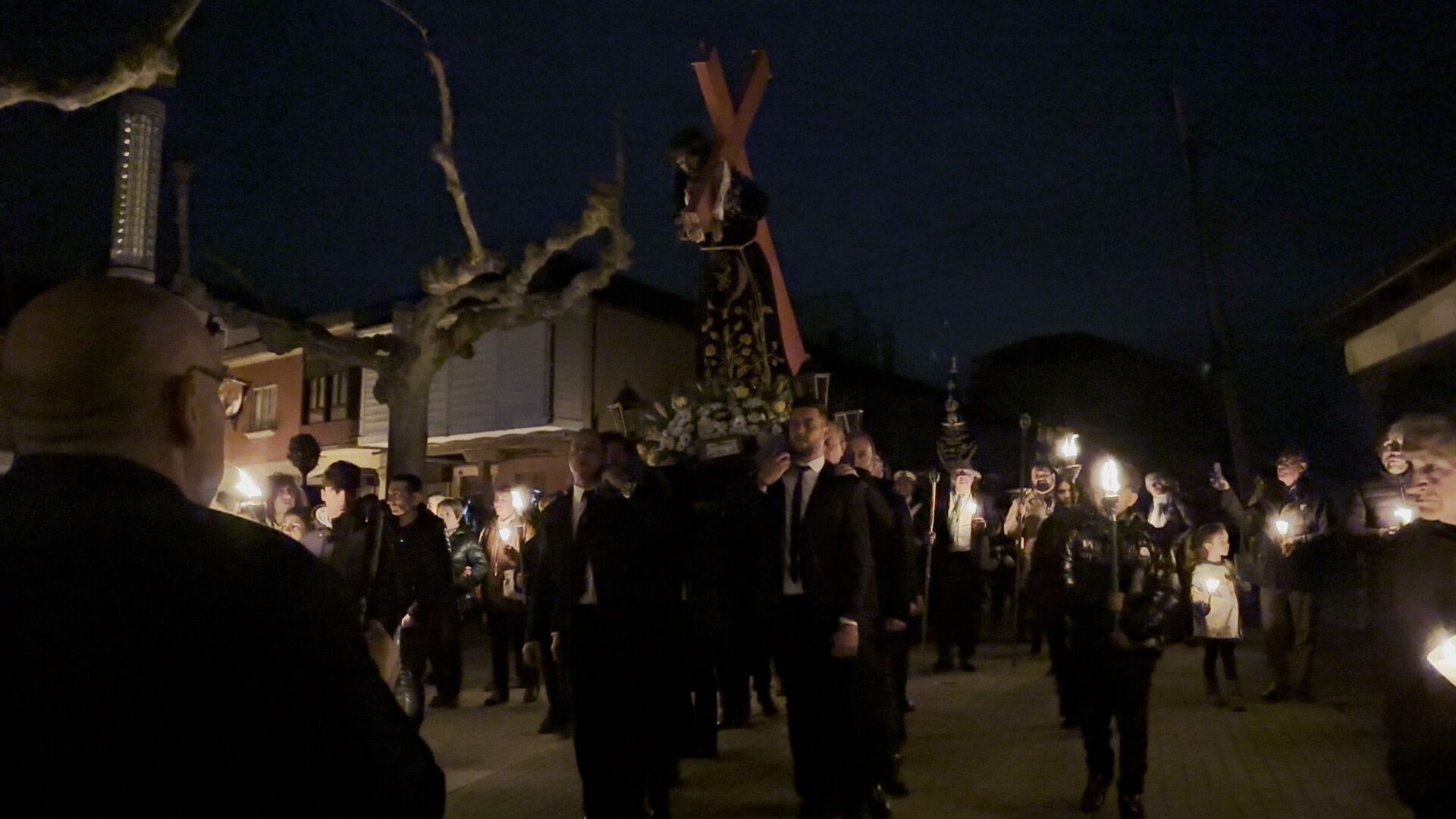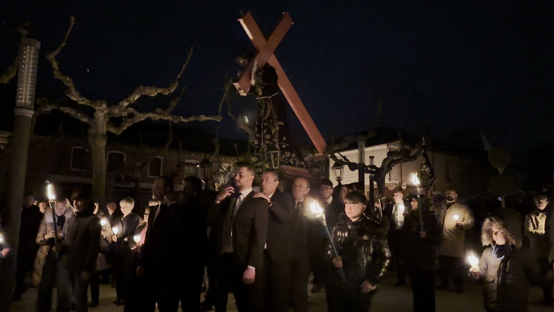 En el pórtico de la Iglesia, el Nazareno era esperado por 100 velas coloreadas por los niños de Herrera y flanqueado por porteadores de antorchas, mientras cientos de personas encendían sus velas para comenzar un recorrido por las calles de una ciudad a oscuras, en la que bares y establecimientos apagaban la luz a su paso y donde el profundo y respetuoso silencio era acompañado por la Banda de Cornetas y Tambores de la Santísima Trinidad con sus cerca de 90 componentes.
