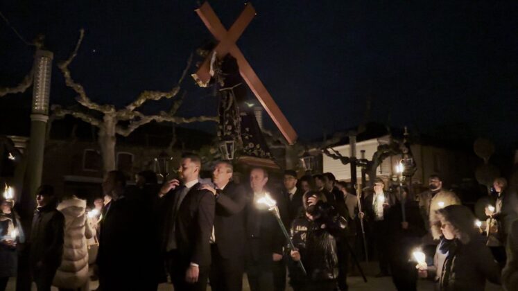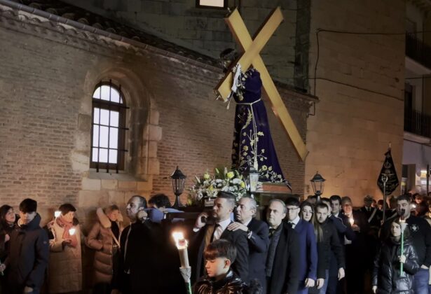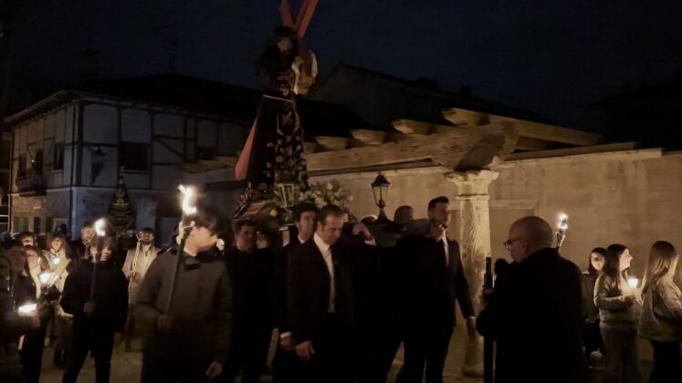 La localidad palentina de Herrera de Pisuerga ha vuelto a sacar a hombros este sábado, 5 de abril, al Nazareno de la cofradía de la Vera Cruz del municipio después del segundo pregón de la Semana Santa ‘Camino a la Luz’