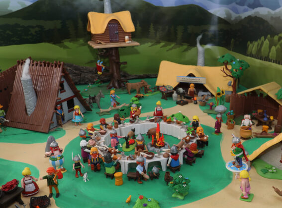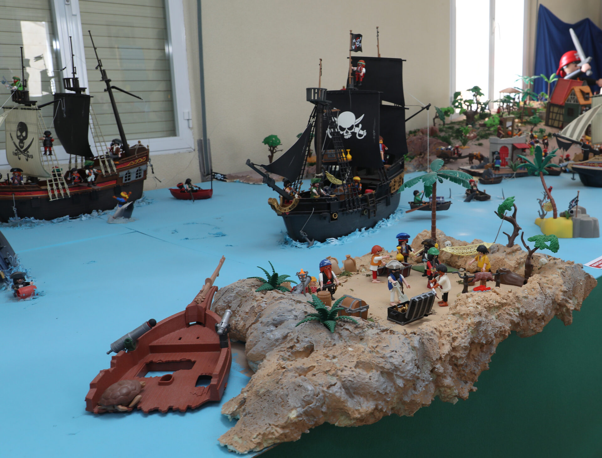 Entre las joyas de la exposición brilla con luz propia el tren eléctrico del Oeste, una pieza tan rara como codiciada. “Es como una maqueta de trenes, pero en escala Playmobil. Muy pronto dejaron de fabricarlo por problemas de seguridad para los niños ya que iban conectadas a la electricidad. Hoy quedan muy pocas”, explica Abraham. Este tren no está solo: muñecos y casas del Oeste, pertenecientes a las primeras colecciones comercializadas por la marca en los años 70, comparten espacio con otras reliquias que son el deleite de cualquier coleccionista. Pero la magia de la exposición no radica solo en las piezas originales. Abraham y Rubén han llevado su creatividad un paso más allá, construyendo escenarios únicos que no se encuentran en ninguna tienda. Un ejemplo es la villa de Astérix y Obélix, recreada con piezas del mítico Fort Bravo, o un imponente barco pirata, nacido de la unión de tres modelos cortados, pegados y pintados a mano. “Son cosas que no puedes comprar”, subraya Abraham con orgullo.