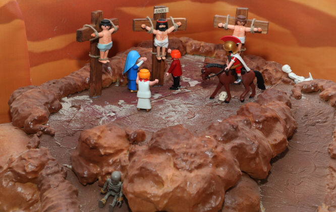 La exposición también es un homenaje al trabajo artesanal. Muchas de las escenas requieren una dedicación meticulosa, desde pintar muñecos para adaptarlos a personajes específicos hasta imprimir accesorios en 3D, como cascos de Star Wars o un Goliat gigante para la escena bíblica de David contra Goliat. “Hemos desmontado, pegado, pintado… Cada pieza cuenta una historia, no solo por lo que representa, sino por el esfuerzo que hay detrás”, añade. Este nivel de detalle transforma la exposición en algo más que una colección, es una obra de arte en constante evolución.