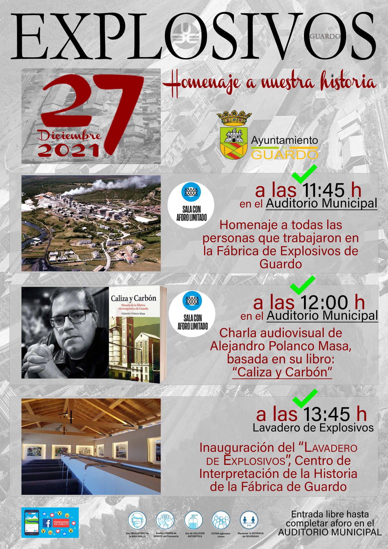 El evento se celebrará en el Auditorio Municipal el día 27 de diciembre de 2021, desde las 11:45 horas. Comenzará con un homenaje a todas las personas que trabajaron en la factoría durante muchos años. Posteriormente, Alejando Polanco Masa, también en el Auditorio Municipal, ofrecerá una charla audiovisual sobre la historia de la fábrica basada en su nuevo libro “Caliza y Carbón”. para una vez finalizada la conferencia, sobre las 13:45, subir al Barrio de Explosivos para proceder a la inauguración y apertura del “Lavadero de Explosivos”, que se convertirá desde ese mismo momento en todo un homenaje a la historia de esta fábrica guardense.