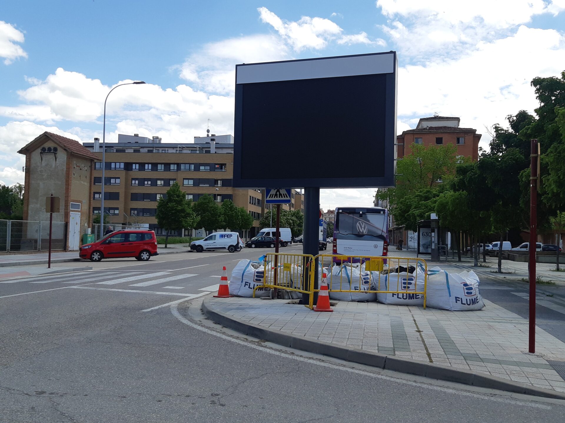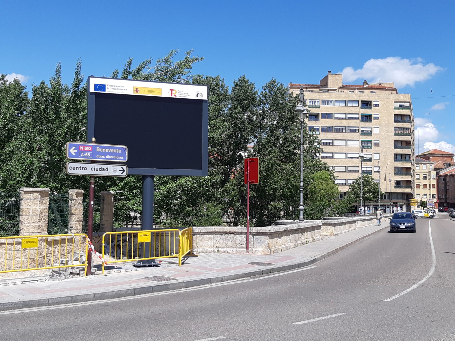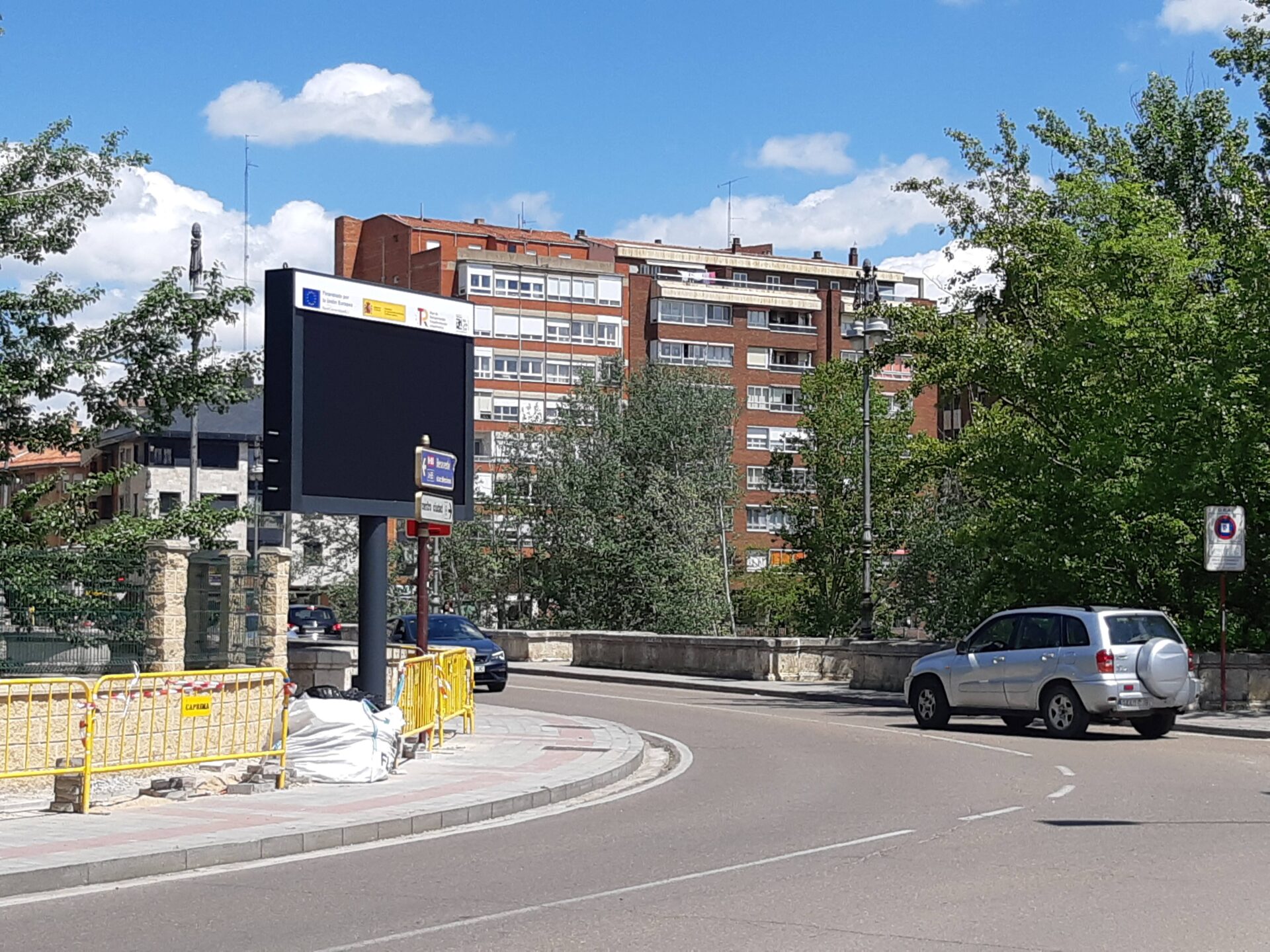 En colocar los seis paneles (uno más de los inicialmente pensados) de tipo led en las seis entradas principales de la ciudad: en la avenida de Asturias; en el Puente Mayor (con vista para los que llegan desde el Hospital y desde la carretera de León y Ampudia), en la avenida de Madrid (junto a la glorieta de la Primera Universidad; en la avenida de San Telmo, junto a la glorieta del Bar Roma, en la avenida de Cuba (junto a la glorieta de Los Rotarios) y en la avenida de Santander en la glorieta. Esta última instalación conlleva también la retirada de la marquesina de autobús que no está asociada al transporte urbano, y que interfiere en los cableados y visibilidad del nuevo panel.
