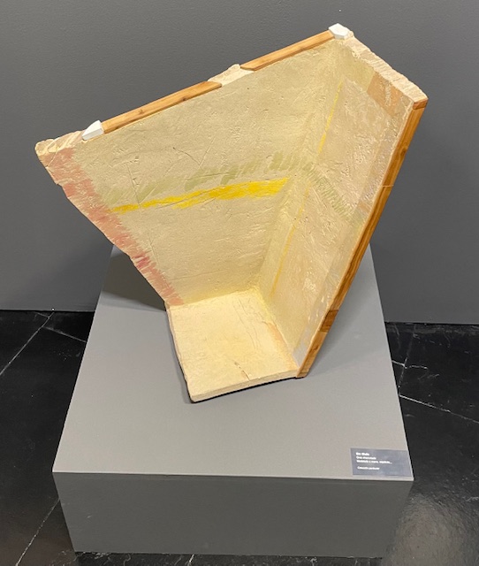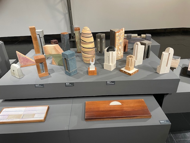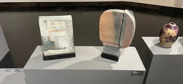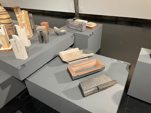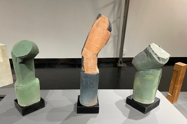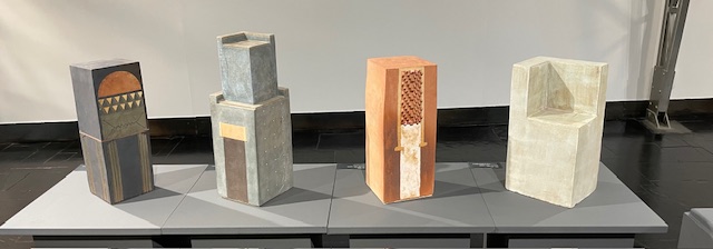 En esta dirección se encuentran numerosas piezas expuestas, que vienen a ser esculturas de pequeño tamaño, verticales y horizontales, donde la línea recta y curva adquieren igualmente protagonismo, como ocurre en la serie ‘Pre-Babel’. Las piezas se asemejan a arquitecturas geométricas y apegadas a la tierra, en concomitancia con la variedad de materiales empleados, como la piedra blanca, el gres o la madera –de este último es la pieza titulada ‘Cuarto creciente’ con una pequeña incrustación de cerámica–, así como la elección de colores fundamentalmente telúricos.