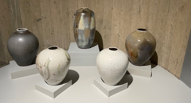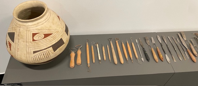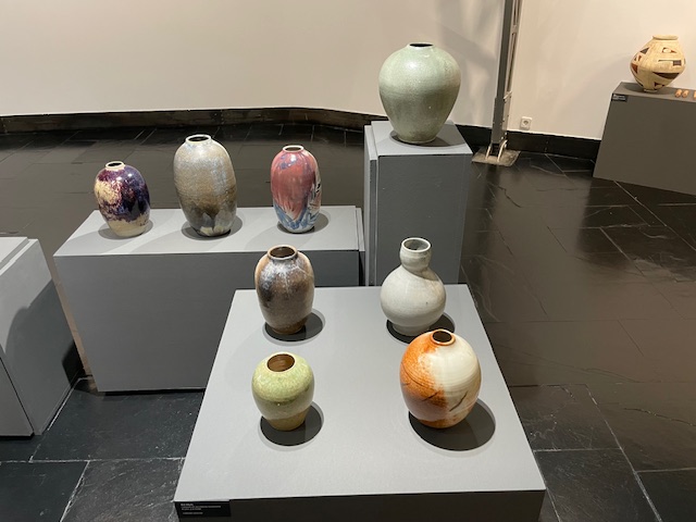 Esta producción utilitaria dio paso a obras más creativas. Javier Guardo contribuyó de manera decisiva, junto a otros muchos artistas, a la elaboración de una cerámica creativa, que dio el salto de la alfarería tradicional a una concepción volumétrica que la sitúa a la par que la escultura. Un ejemplo de ello es la primera obra con la que se encuentra el visitante en el recorrido de la muestra, ‘Sin título’, creada en gres chamutado y modelada a mano con espátula. La línea recta que se observa en esta pieza se extenderá a una parte importante de la creación, así como la estructura abierta que ofrece.