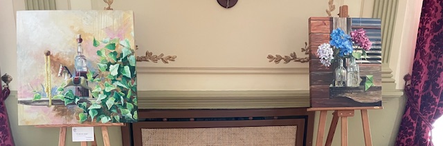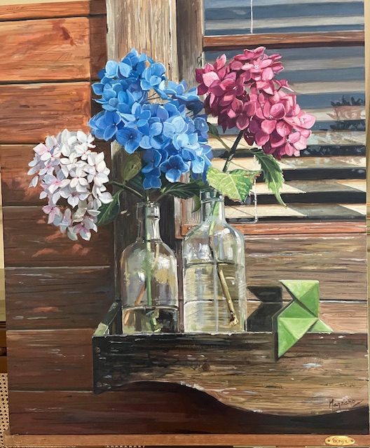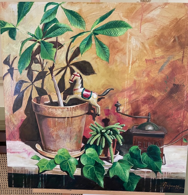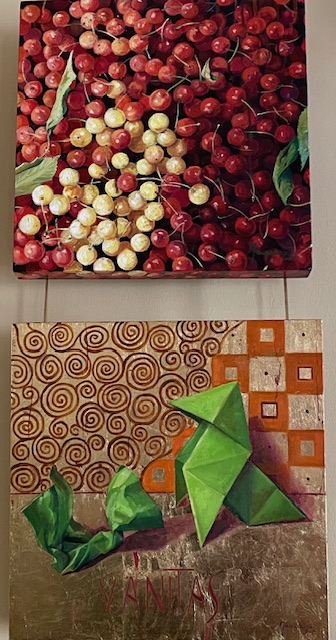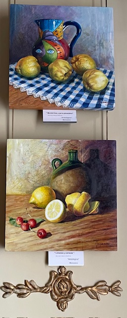 Los bodegones son numerosos en la exposición, todos ellos muy cuidados en sus elementos, donde se combinan macetas, flores, ramas, pajaritas, limones, uvas, cerezas, membrillos… Hasta una jarra picassiana. Son cuadros en los que el color se hace más intenso. De hecho, algunas de estas obras sirven al pintor para probar matices y explorar formas.