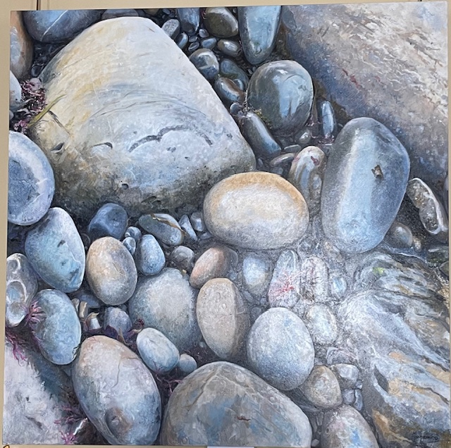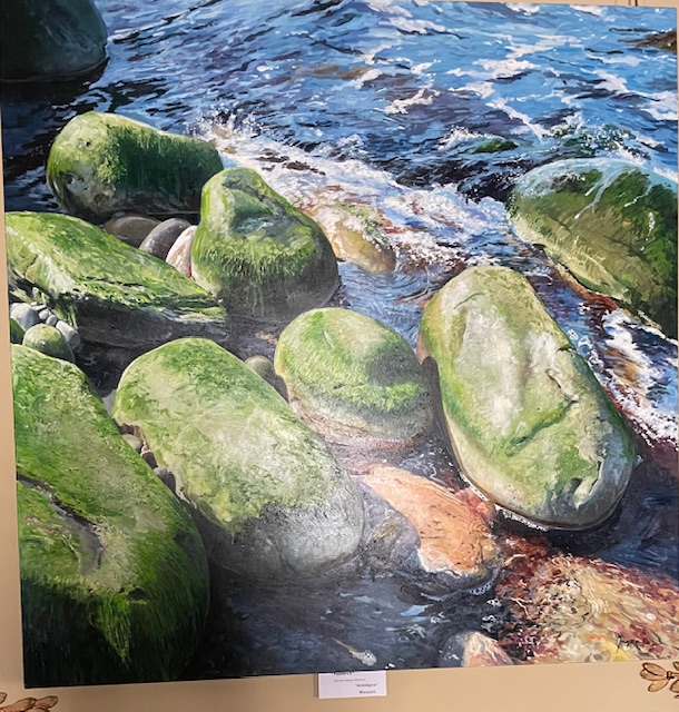 El visitante observa dos ejemplos de la serie ‘Pedreru’, que responden al paisaje cercano, de primer plano, en donde la textura de la piedra casi se acaricia, así como la riqueza cromática. Con una primacía del gris en el número 5, las pinceladas de violetas, naranjas o azules salpican el cuadro para inferirle una fuerza mayor, mientras que en el número 4 la presencia del movimiento del agua y su transparencia compensa la fría materia pétrea.