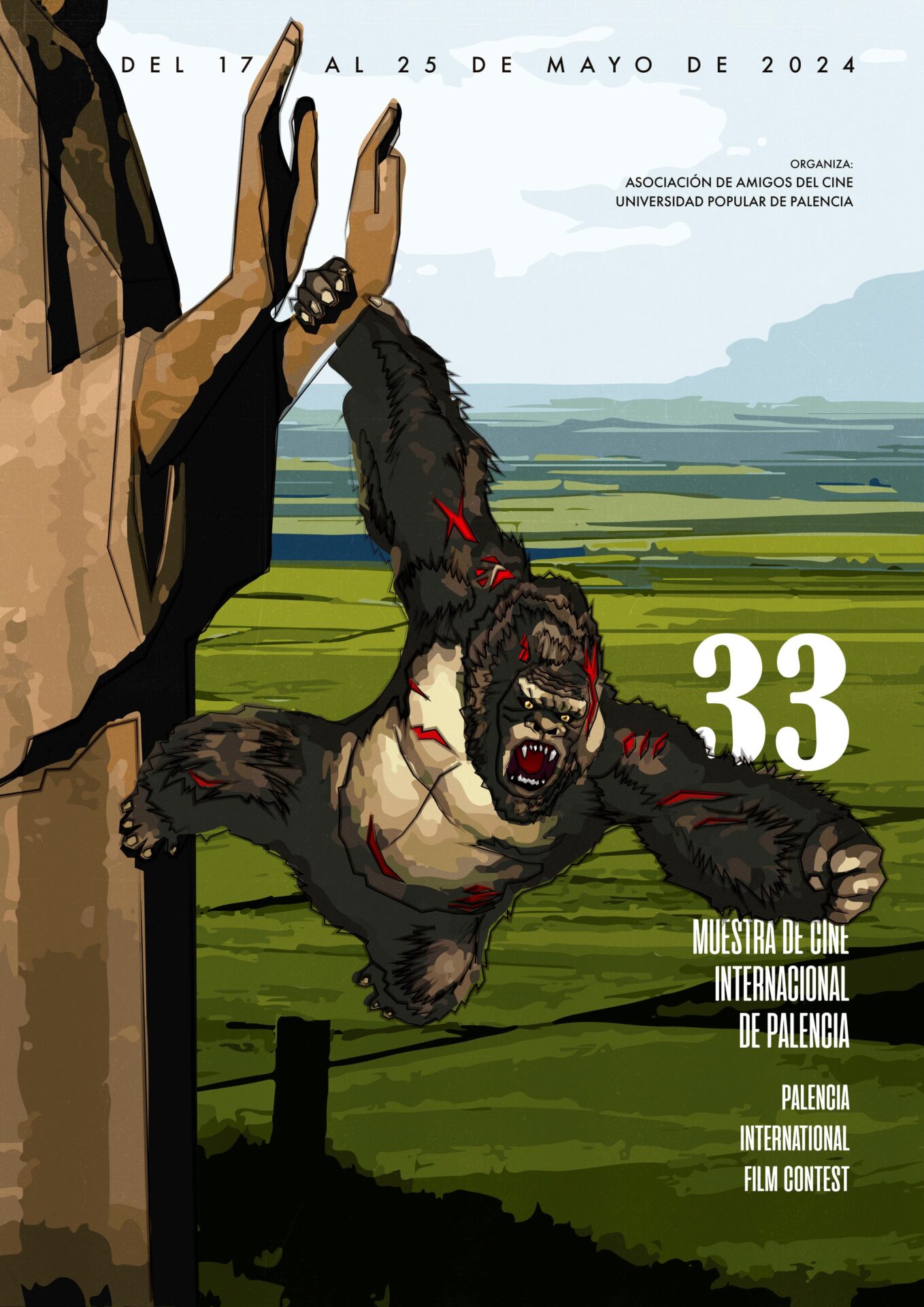 La mítica figura de King Kong protagoniza la imagen elegida por la Muestra de Cine Internacional de Palencia para el cartel de su trigésima tercera edición, que tendrá lugar entre los días 17 y 25 de mayo de 2024. Su autor es el diseñador afincado en Palencia Alberto Esteban Olano, quién se inspira en la producción norteamericana filmada por Merian C. Cooper y Ernest B. Schoedsack en 1933 para proponer un diseño que celebra el 80 aniversario del conocido filme de aventuras y que dialoga con uno de los elementos más significativos y reconocibles de la ciudad, el Cristo del Otero.