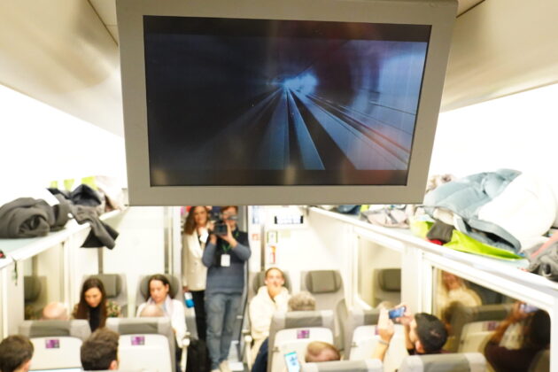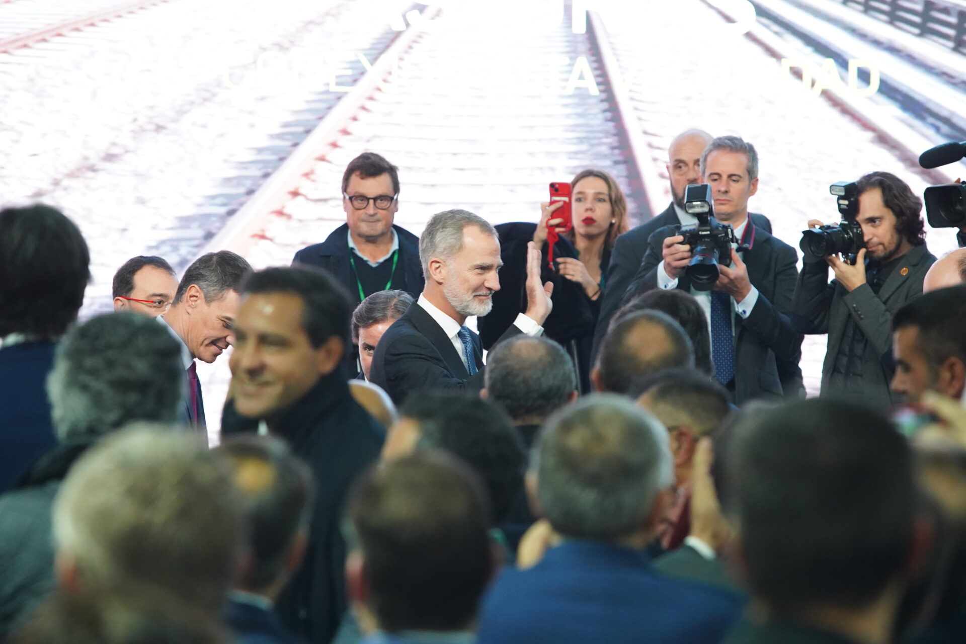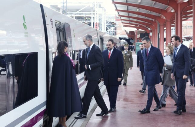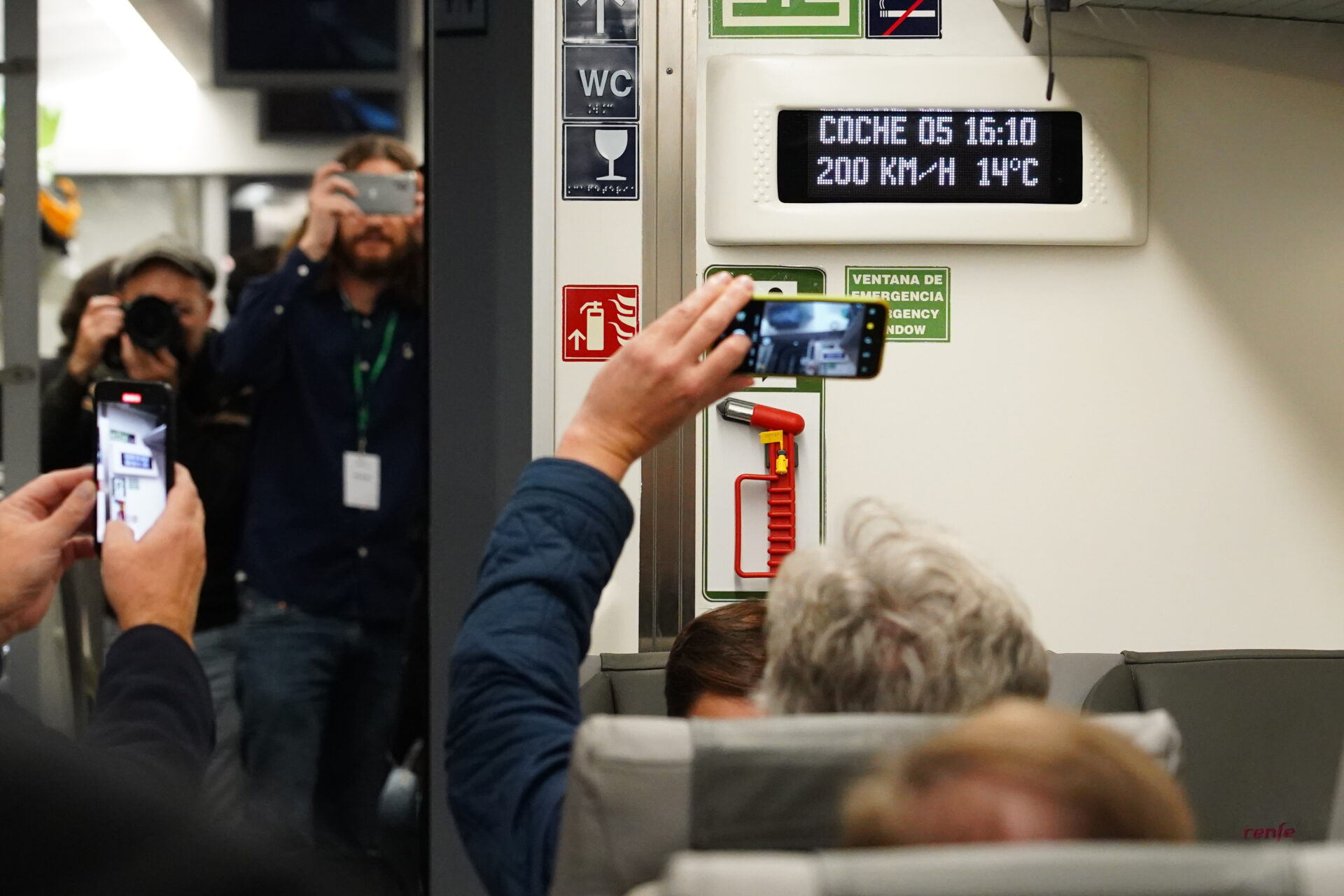 A bordo viajaba ya el Rey Felipe VI, acompañado por el presidente del Gobierno, Pedro Sánchez, y el ministro de Transportes y Movilidad Sostenible, Óscar Puente, así como el presidente del Principado de Asturias, Adrián Barbón, junto a otros ministros que también tuvieron relación con esta construcción, como los socialistas Magdalena Álvarez y José Luis Ábalos o el ‘popular’ Íñigo de la Serna. Ya en suelo leonés, tanto el monarca, como Sánchez, Puente y Barbón abandonaron el vehículo durante unos diez minutos para recibir al presidente de la Junta de Castilla y León, Alfonso Fernández Mañueco.