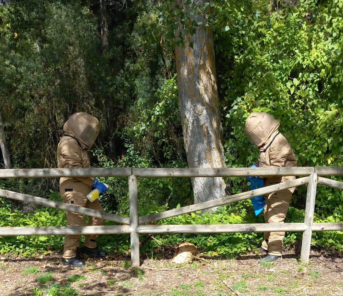 Los tres miembros del equipo, enfundados en los trajes de apicultura de los que dota la Diputación a los Parques han logrado neutralizar el nido, introduciéndolo en varias bolsas y tratando de evitar que quedaran insectos sueltos en las inmediaciones que pudieran suponer algún problema posteriormente.