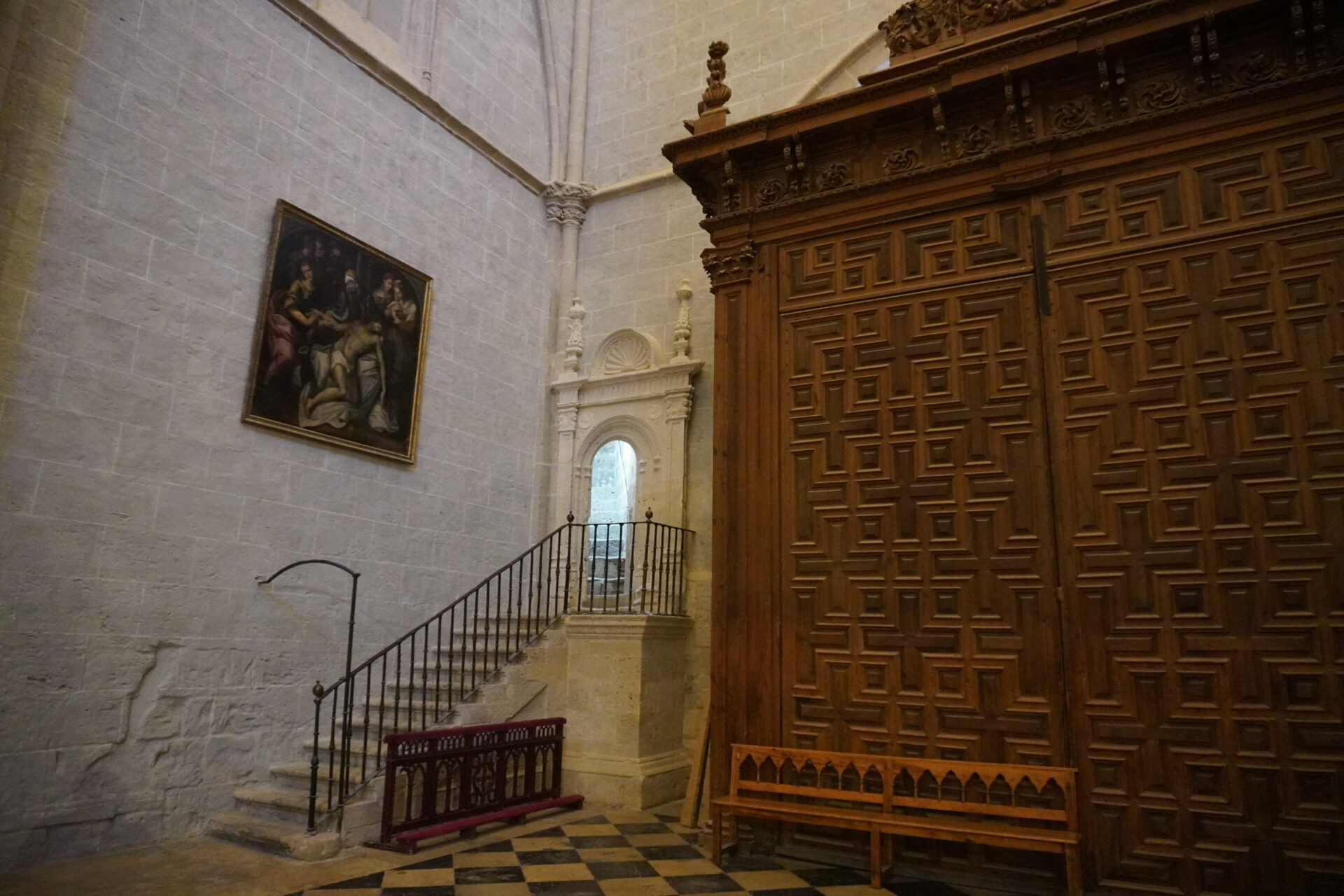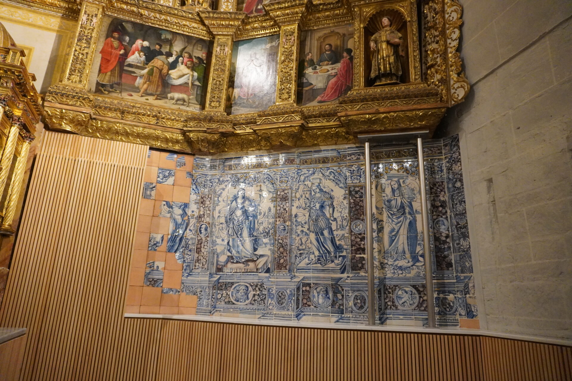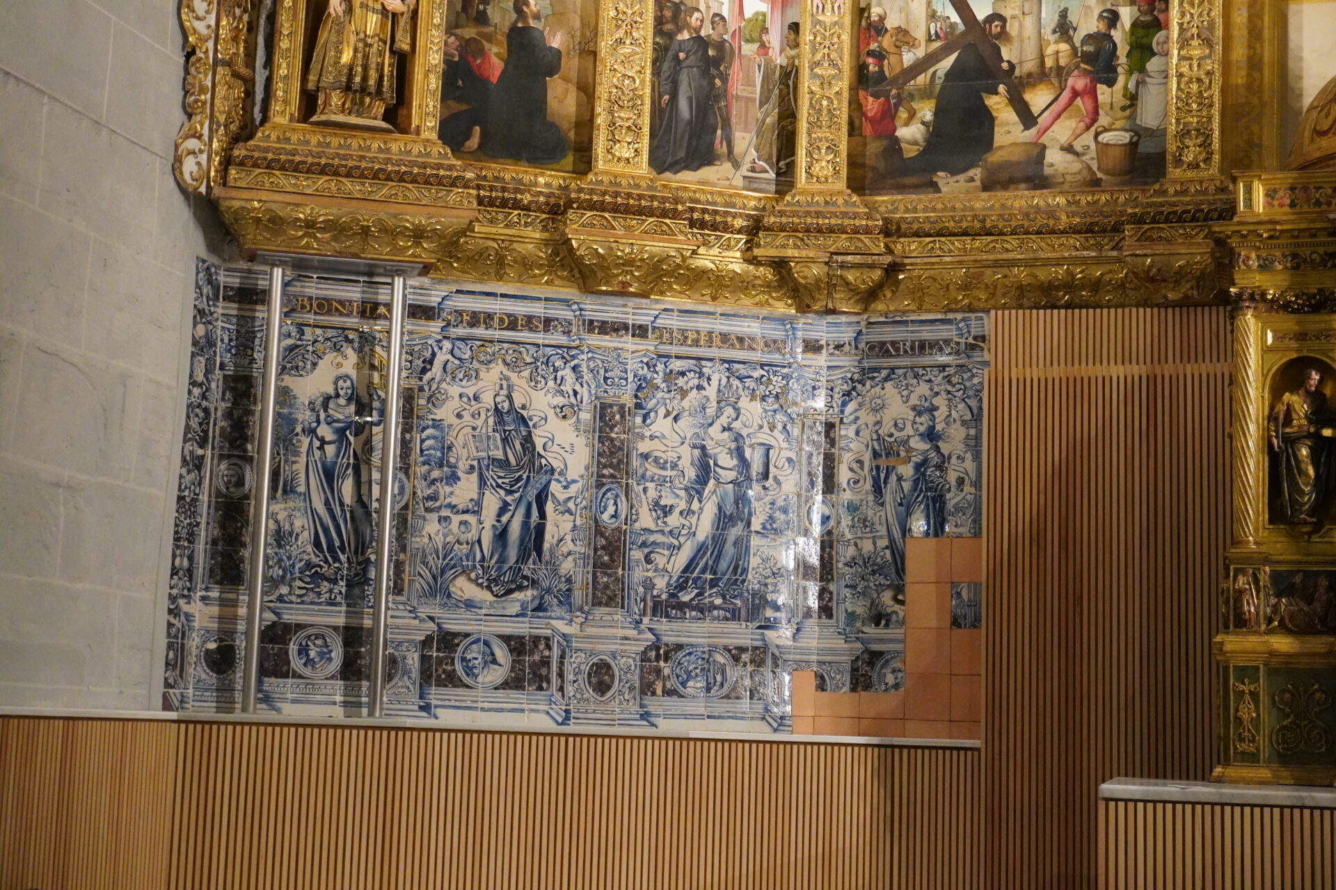 En la Capilla Mayor además se ha consolidado de manera definitiva la azulejería (S. XVI) del banco del retablo mayor. “Hay una novedad, que en la muestra de Renacer no se vio, y es que aunque se veían siete virtudes, en realidad son ocho las existentes. Uno de los paneles en un determinado momento de la historia se eliminó para hacer un paso a la parte de atrás del retablo. El de la Templanza había desaparecido y ahora se han encontrado varios fragmentos que se han restituido en su posición”.